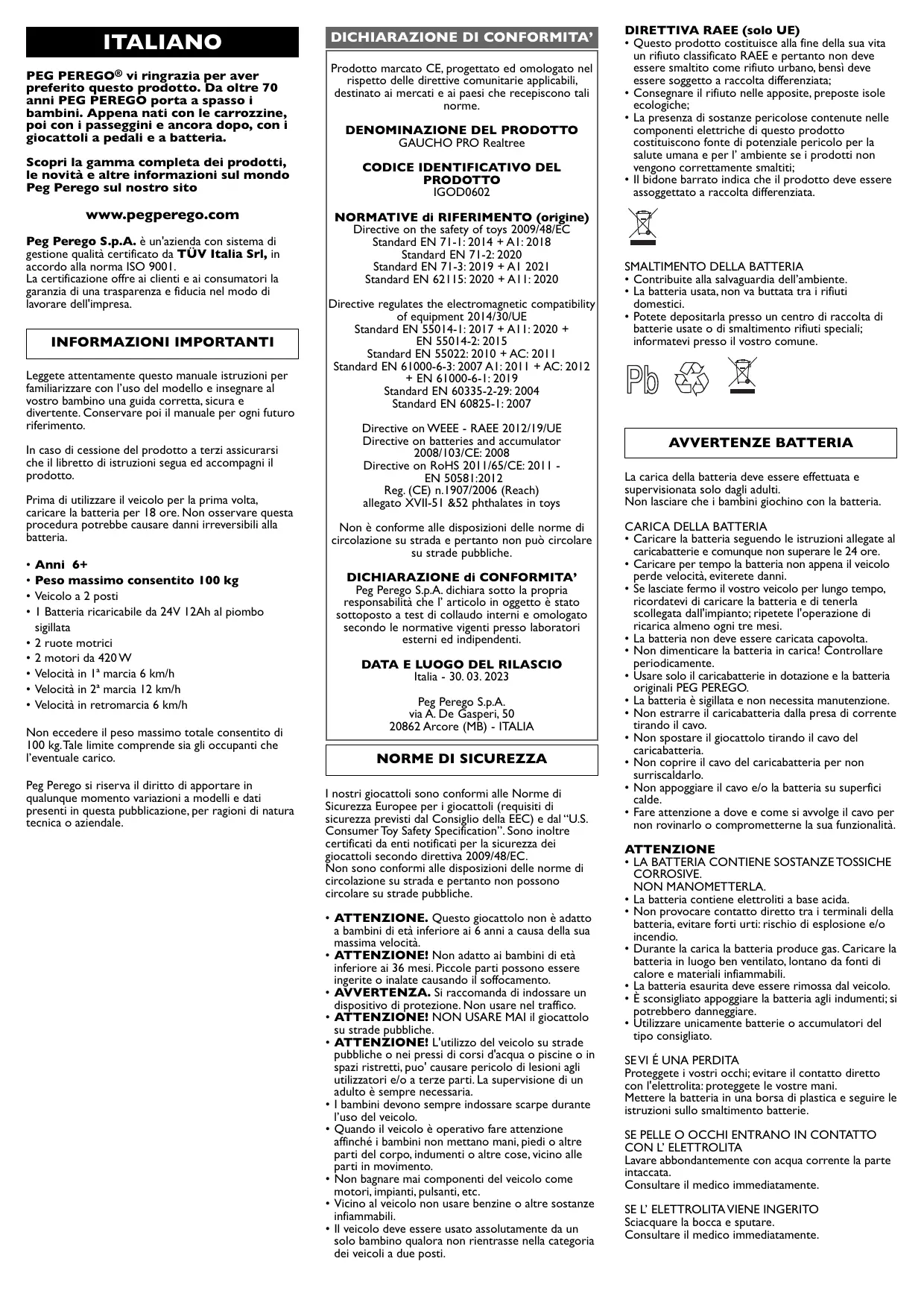 Scarica le istruzioni per il tuo TOUT TERRAIN in formato PDF gratuitamente! Trova il tuo manuale GAUCHO PRO Realtree - PEG PEREGO e riprendi in mano il tuo dispositivo elettronico. In questa pagina sono pubblicati tutti i documenti necessari per l'utilizzo del tuo dispositivo. GAUCHO PRO Realtree del marchio PEG PEREGO.