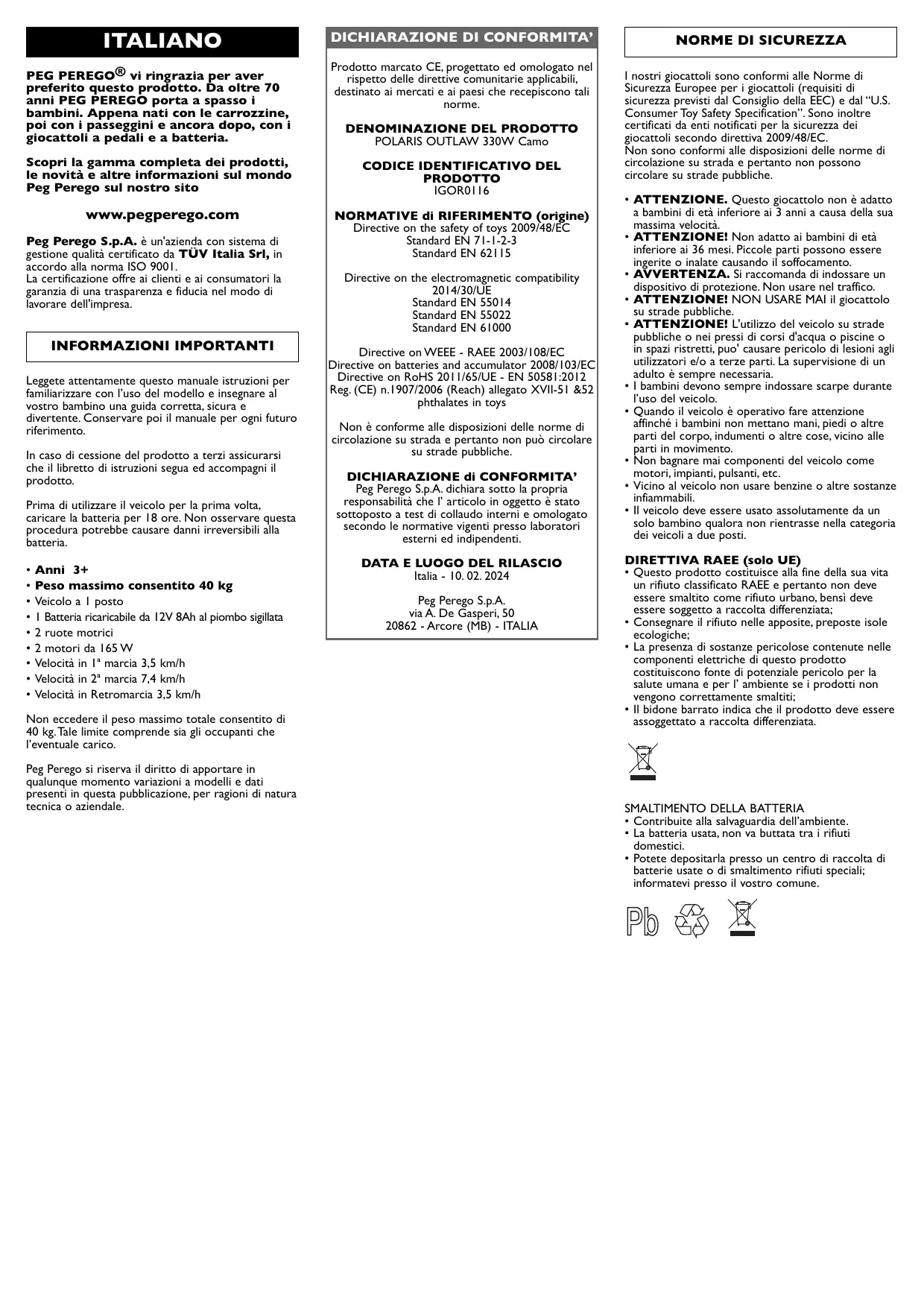 Trova gratuitamente il manuale del dispositivo Polaris Outlaw 330W Camo PEG PEREGO in formato PDF.