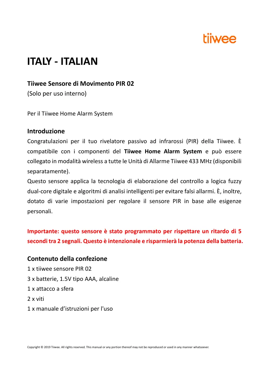 MANUALE UTENTE PIR sensor 02 Tiiwee