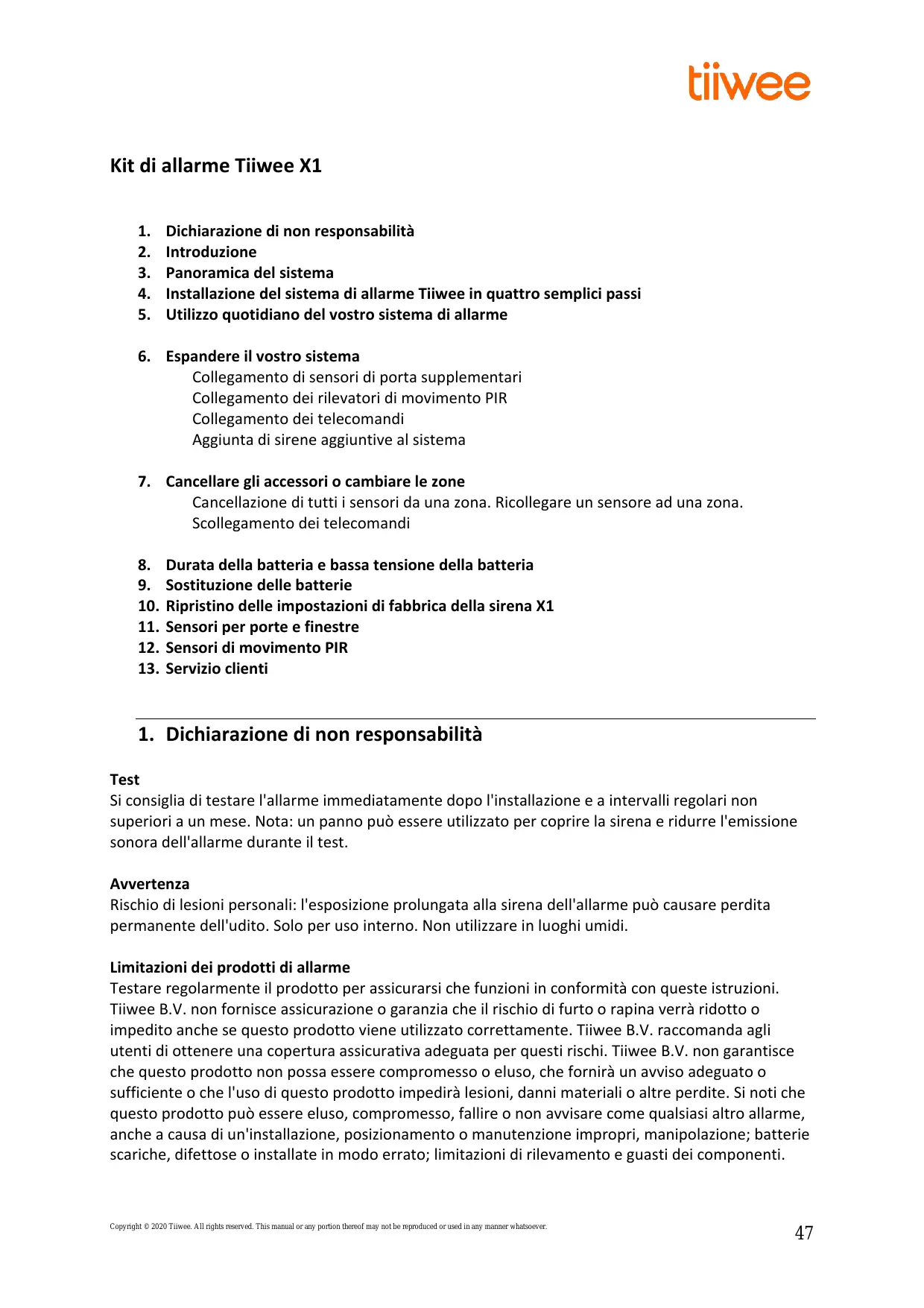 Scarica le istruzioni per il tuo Sistema di allarme in formato PDF gratuitamente! Trova il tuo manuale X1 - Tiiwee e riprendi in mano il tuo dispositivo elettronico. In questa pagina sono pubblicati tutti i documenti necessari per l'utilizzo del tuo dispositivo. X1 del marchio Tiiwee.