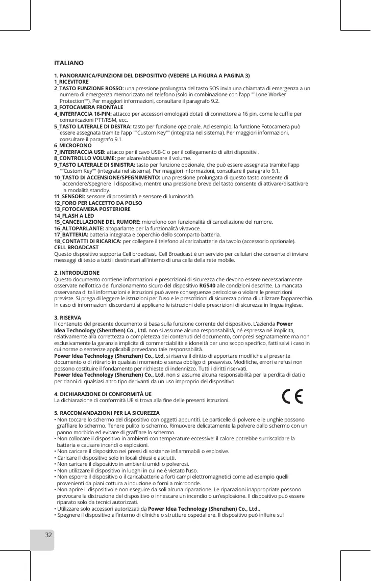 1. PANORAMICA/FUNZIONI DEL DISPOSITIVO (VEDERE LA FIGURA À PAGINA 3) A RICEVITORE ZTASTO FUNZIONE ROSSO: una pressione prolungata del tasto SOS invia una chiamata di emergenza a un numero di emergenza memorizzato nel telefono (solo in combinazione con l'app “’Lone Worker Protection”) Per maggloriinformazion, consulare l paragrafo 92. 3 FOTOCAMERA FRONTALE AINTERFACCIA 16-PIN: attacco per accessori omalogal dotatl di connettore à 16 pin, come le cuffl per comunicazioni PTT/RSM, ec. TASTO LATERALE DI DESTRA: asto per funzione opzionale. Ad esernplo, la funziane Fotocamera puè essere assegnata tramite app "Custom Key” (integrata nel sistema). Per magglrinformazioni, consurtare l paragrafo 8.1 6 MICROFONG 7-INTERFACCIA USB: atiacco per l cavo USB-C 0 per lcolegamento ci ali dispos #-CONTROLLO VOLUME: per alzare/abbassare volume. S_TASTO LATERALE DI SINISTRA:Lasto per furzione opzionale, che pub essere assegnata tramite l'app “Custom Key” (ntegrata nel sistema. Per maggiorInformazionl, consultare il paragrafo 9.1