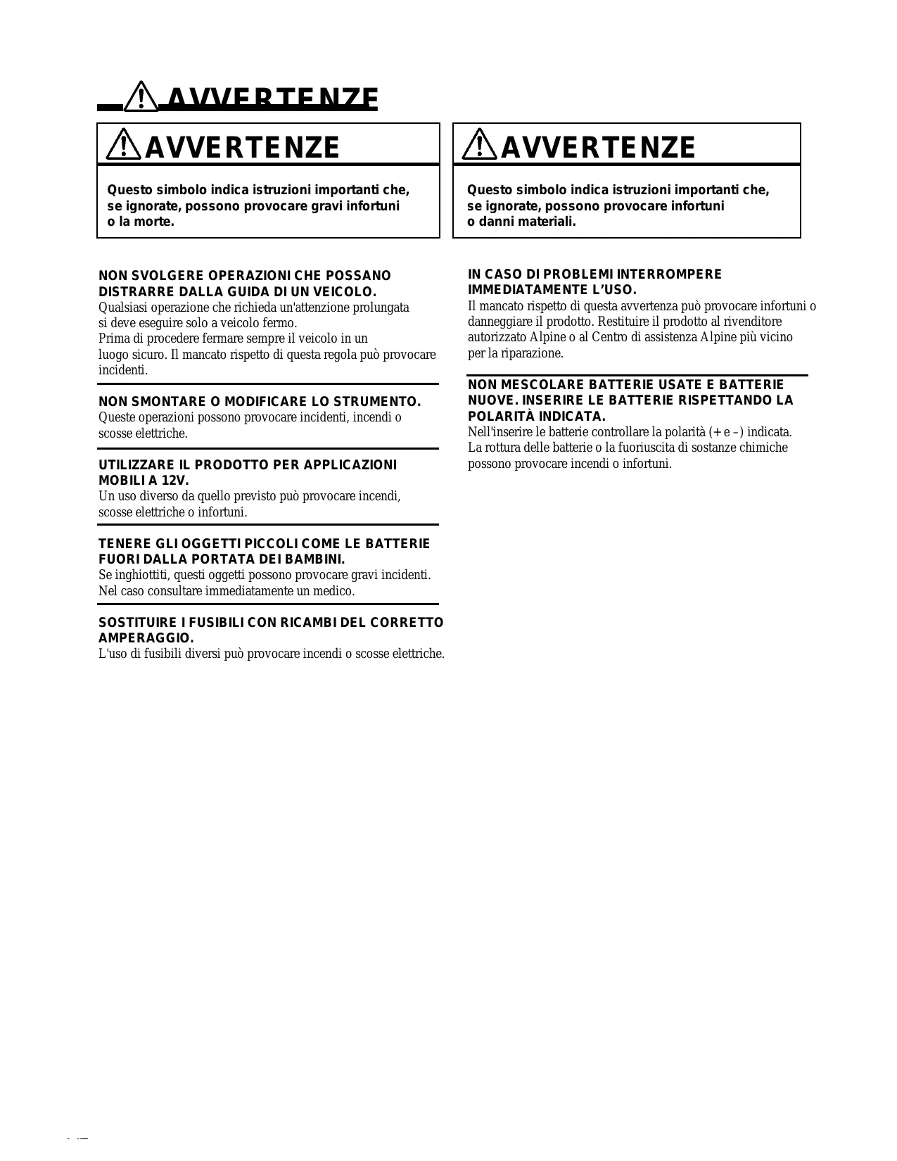 IMMEDIATAMENTE L’USO. Il mancato rispetto di questa avvertenza può provocare infortuni o danneggiare il prodotto. Restituire il prodotto al rivenditore autorizzato Alpine o al Centro di assistenza Alpine più vicino per la riparazione.