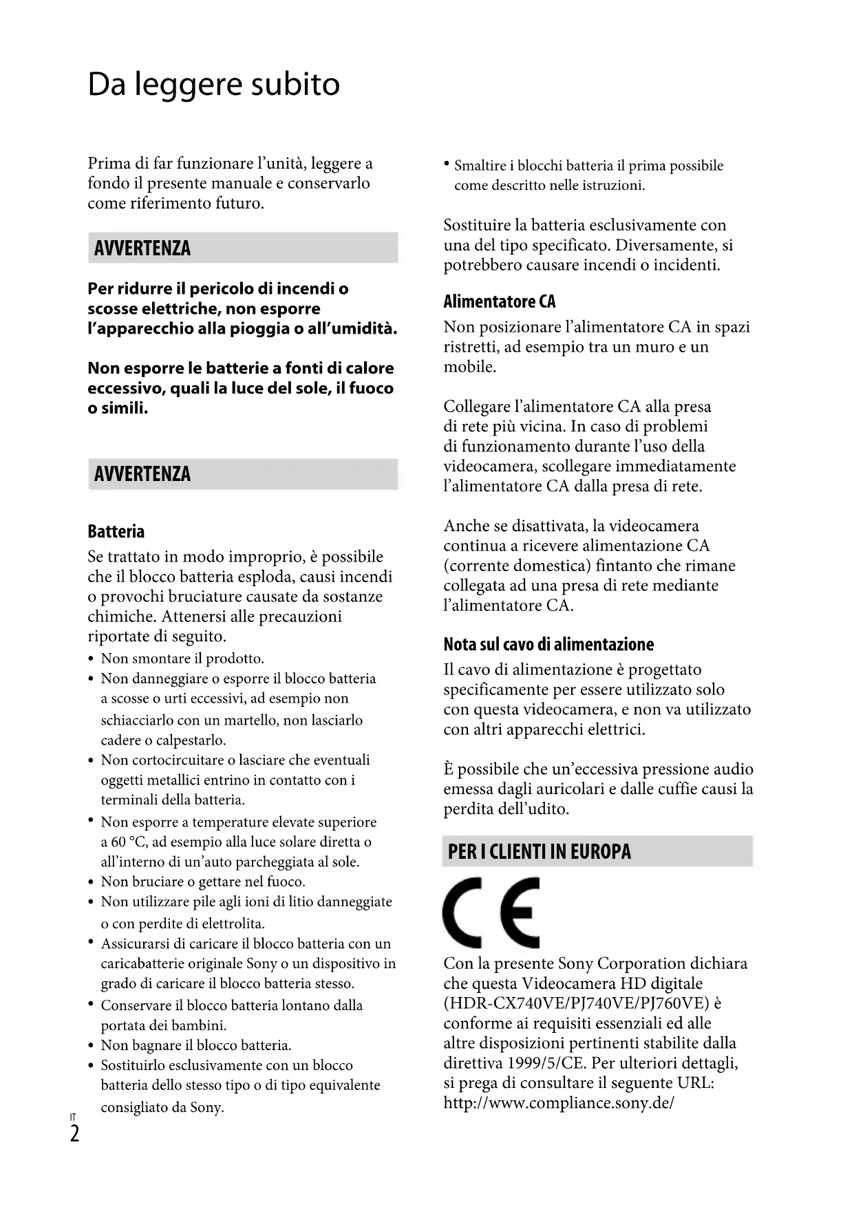 PER I CLIENTI IN EUROPA Con la presente Sony Corporation dichiara