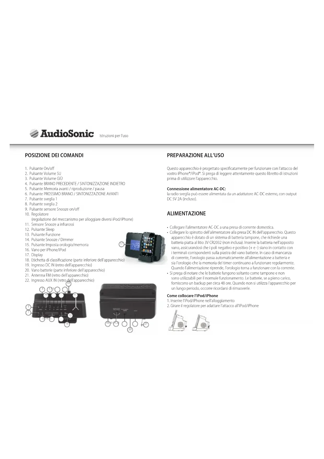 Questo apparecchio è progettato specificatamente per funzionare con l’attacco del vostro iPhone®/iPod®. Si prega di leggere attentamente questo libretto di istruzioni prima di utilizzare l’apparecchio. Connessione alimentatore AC-DC: la radio sveglia può essere alimentata da un adattatore AC-DC esterno, con output DC 5V 2A (incluso). ALIMENTAZIONE
