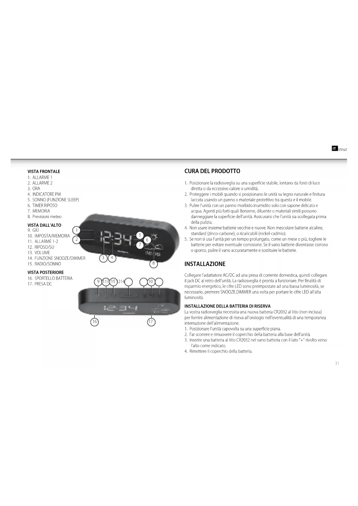 La vostra radiosveglia necessita una nuova batteria CR2032 al litio (non inclusa) per fornire alimentazione di riseva all’orologio nell’eventualità di una temporanea interruzione dell’alimentazione.