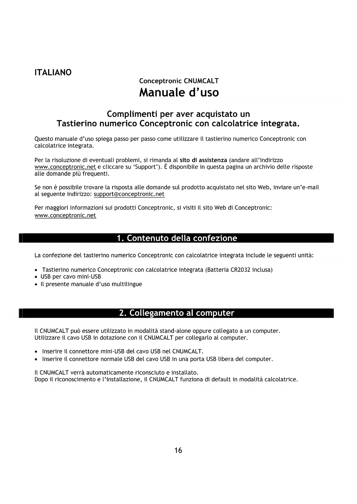 Conceptronic CNUMCALT Manuale d’uso Complimenti per aver acquistato un Tastierino numerico Conceptronic con calcolatrice integrata. Questo manuale d’uso spiega passo per passo come utilizzare il tastierino numerico Conceptronic con calcolatrice integrata. Per la risoluzione di eventuali problemi, si rimanda al sito di assistenza (andare all’indirizzo www.conceptronic.net e cliccare su ‘Support’). È disponibile in questa pagina un archivio delle risposte alle domande più frequenti. Se non è possibile trovare la risposta alle domande sul prodotto acquistato nel sito Web, inviare un’e-mail al seguente indirizzo: support@conceptronic.net