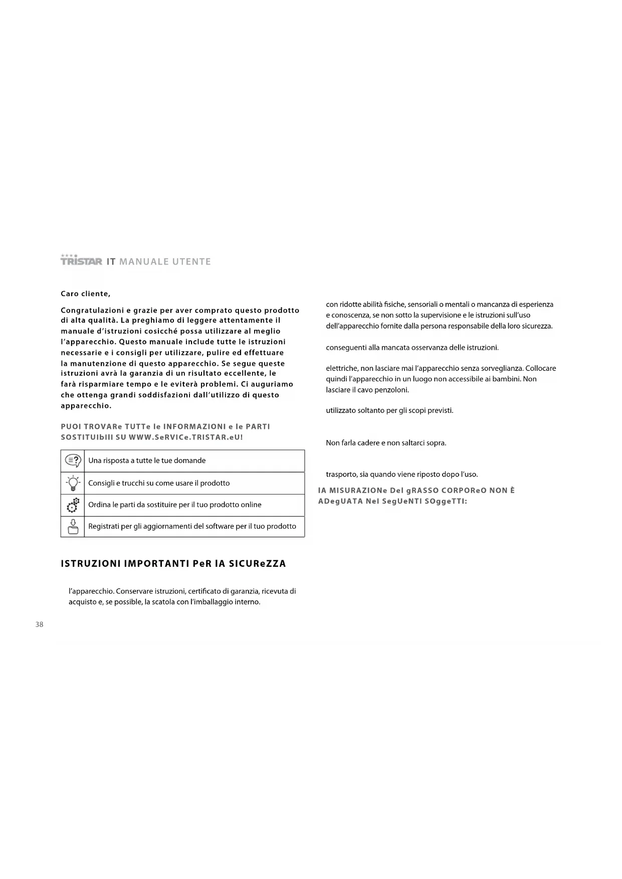 nel manuale di istruzioni annulleranno la garanzia. Tristar non è