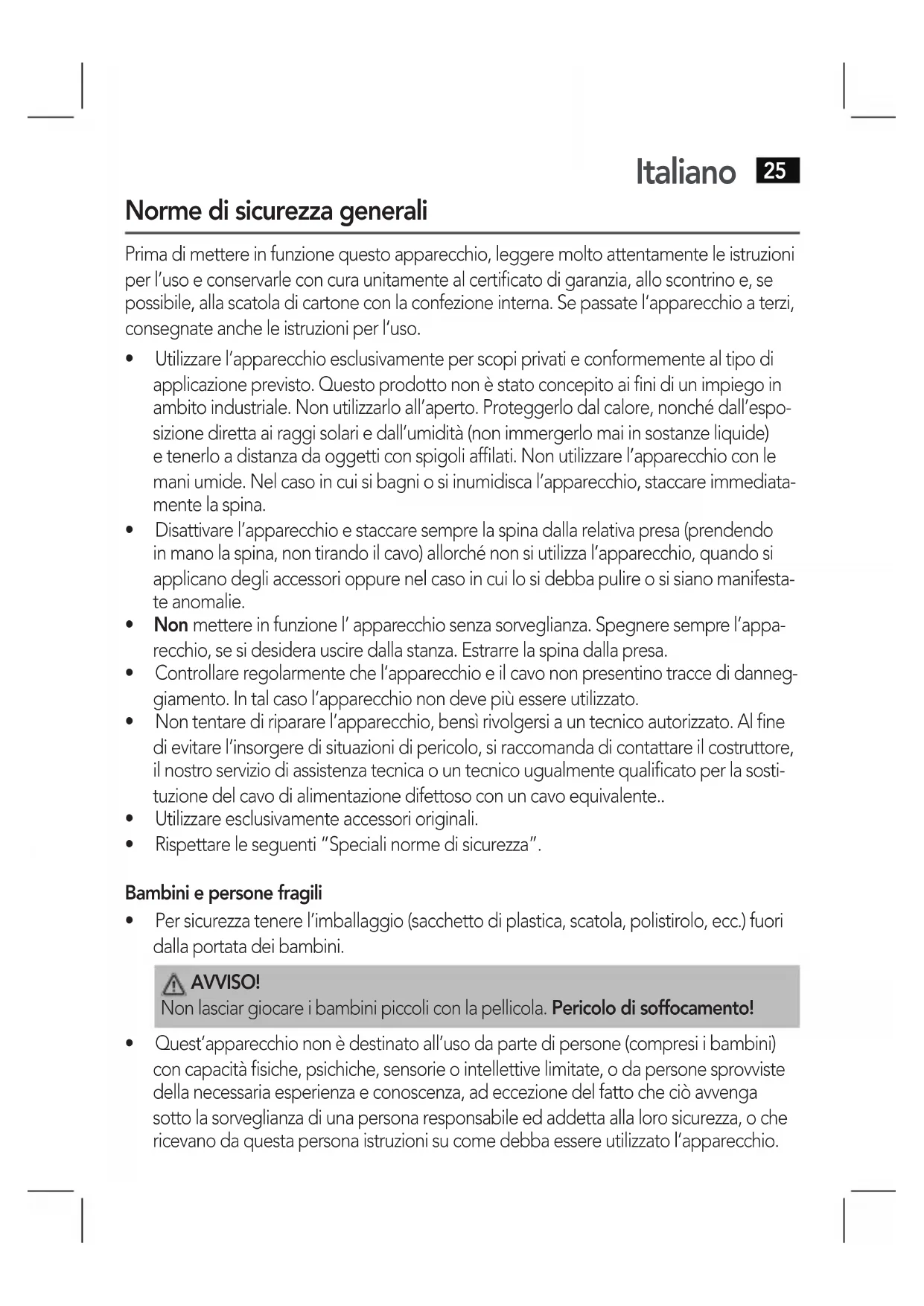 - Rispettareleseguenti“Specialinormedisicurezza”. Bambini e persone fragili
