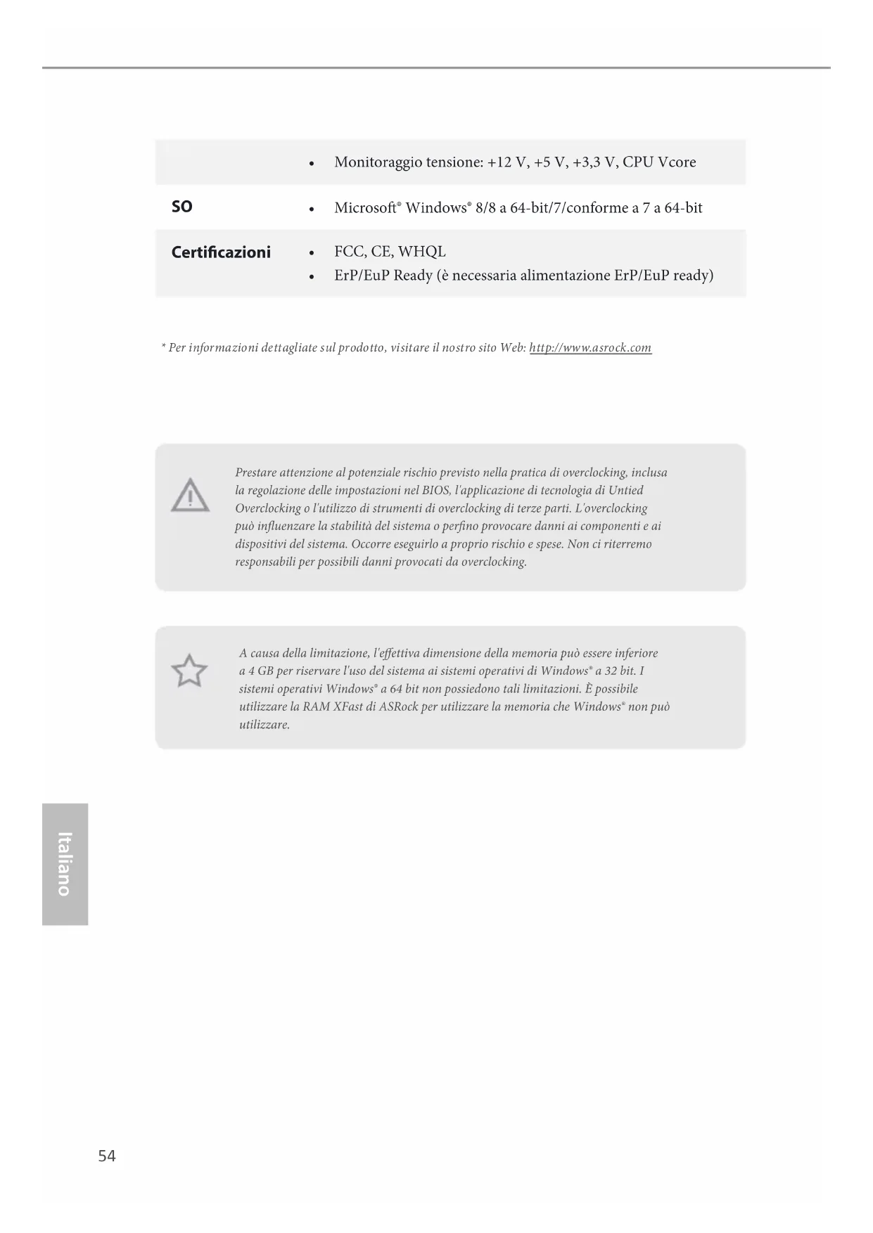- Per informazioni dettagliate sul prodotto, visitare il nostro sito Web: http://www.asrock.com A causa della limitazione, l'eettiva dimensione della memoria può essere inferiore a 4 GB per riservare l'uso del sistema ai sistemi operativi di Windows® a 32 bit. I sistemi operativi Windows® a 64 bit non possiedono tali limitazioni. È possibile utilizzare la RAM XFast di ASRock per utilizzare la memoria che Windows® non può utilizzare.B85M Pro4