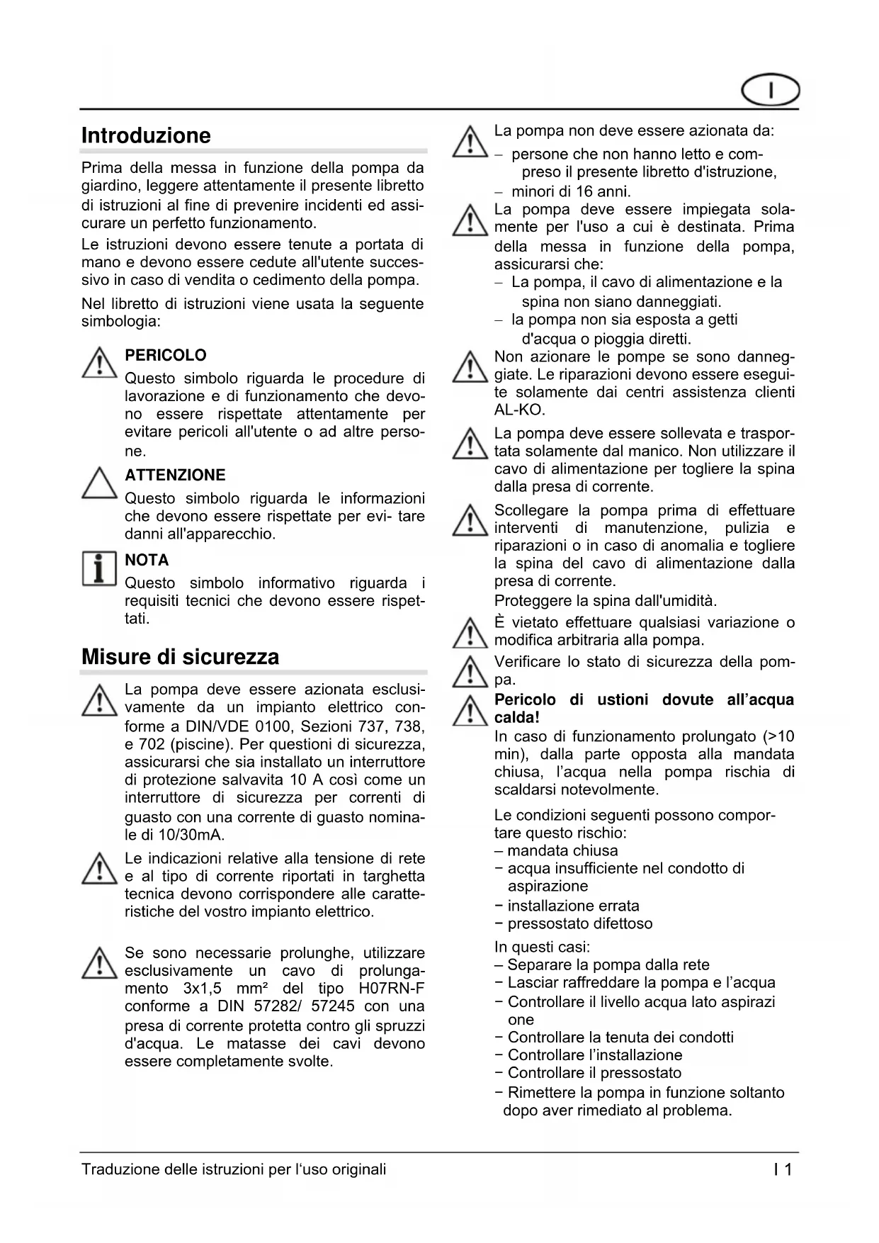PERICOLO Questo simbolo riguarda le procedure di lavorazione e di funzionamento che devo- no essere rispettate attentamente per evitare pericoli all'utente o ad altre perso- ne. ATTENZIONE Questo simbolo riguarda le informazioni che devono essere rispettate per evi- tare danni all'apparecchio. NOTA Questo simbolo informativo riguarda i requisiti tecnici che devono essere rispet- tati. Misure di sicurezza La pompa deve essere azionata esclusi- vamente da un impianto elettrico con- forme a DIN/VDE 0100, Sezioni 737, 738, e 702 (piscine). Per questioni di sicurezza, assicurarsi che sia installato un interruttore di protezione salvavita 10 A così come un interruttore di sicurezza per correnti di guasto con una corrente di guasto nomina- le di 10/30mA. Le indicazioni relative alla tensione di rete e al tipo di corrente riportati in targhetta tecnica devono corrispondere alle caratte- ristiche del vostro impianto elettrico. Se sono necessarie prolunghe, utilizzare esclusivamente un cavo di prolunga- mento 3x1,5 mm² del tipo H07RN-F conforme a DIN 57282/ 57245 con una presa di corrente protetta contro gli spruzzi d'acqua. Le matasse dei cavi devono essere completamente svolte. La pompa non deve essere azionata da: − persone che non hanno letto e com- preso il presente libretto d'istruzione, − minori di 16 anni. La pompa deve essere impiegata sola- mente per l'uso a cui è destinata. Prima della messa in funzione della pompa, assicurarsi che: − La pompa, il cavo di alimentazione e la spina non siano danneggiati. − la pompa non sia esposta a getti d'acqua o pioggia diretti. Non azionare le pompe se sono danneg- giate. Le riparazioni devono essere esegui- te solamente dai centri assistenza clienti AL-KO. La pompa deve essere sollevata e traspor- tata solamente dal manico. Non utilizzare il cavo di alimentazione per togliere la spina dalla presa di corrente. Scollegare la pompa prima di effettuare interventi di manutenzione, pulizia e riparazioni o in caso di anomalia e togliere la spina del cavo di alimentazione dalla presa di corrente. Proteggere la spina dall'umidità. È vietato effettuare qualsiasi variazione o modifica arbitraria alla pompa. Verificare lo stato di sicurezza della pom- pa. Pericolo di ustioni dovute all’acqua calda! In caso di funzionamento prolungato (>10 min), dalla parte opposta alla mandata chiusa, l’acqua nella pompa rischia di scaldarsi notevolmente. Le condizioni seguenti possono compor- tare questo rischio: – mandata chiusa − acqua insufficiente nel condotto di aspirazione − installazione errata − pressostato difettoso In questi casi: – Separare la pompa dalla rete − Lasciar raffreddare la pompa e l’acqua − Controllare il livello acqua lato aspirazi one − Controllare la tenuta dei condotti − Controllare l’installazione − Controllare il pressostato − Rimettere la pompa in funzione soltanto dopo aver rimediato al problema. Traduzione delle istruzioni per l‘uso originali I 1Utilizzo I 2 Traduzione delle istruzioni per l‘uso originali Applicazioni previste La pompa è destinata all'utilizzo privato in casa e in giardino. Deve essere utilizzata solamente nell'ambito dei limiti d'impiego conformemente alle caratteristiche tecniche. La pompa è idonea esclusivamente per le seguenti applicazioni: − irrigazioni e annaffiamenti (per esempio di giardini pubblici, aiuole e giardini in genera- le); − svuotamento di serbatoi o travaso (per e- sempio piscine); − drenaggio di pozzi, botti d'acqua piovana e cisterne. La pompa è idonea esclusivamente per il pom- paggio dei seguenti liquidi: − acqua chiara; − acqua piovana; − acqua contenente cloro (acqua per piscine). Applicazioni vietate La pompa non deve essere impiegata in servizio continuo. La pompa non è idonea per il pompag- gio di: − acqua potabile; − acqua salata; − alimenti liquidi; − liquame; − sostanze corrosive, chimiche; − liquidi acidi, infiammabili, esplosivi o volatili; − liquidi con temperatura superiore a 35°C.; − acqua sabbiosa o liquidi abrasivi. Descrizione della pompa Pompada giardino/accessori (Figure A, B, C) 1 Bocca d'aspirazione/connessione tubo d'a- spi-razione 2 Tappo di riempimento 3 Bocca di mandata/connessione tubo di man- data 4 Carena motore 5 Cavo di alimentazione 6 Interruttore ON/OFF 7 Base pompa 8 Corpo pompa 9 Tappo di scarico del vano pompa 10 Tappo di scarico del vano filtro 11 Filtro coperchio trasparente 12 Guarnizioni del filtro 13 Filtro 14 Valvola antiritorno 15 Guarnizione 16 Guarnizione (coperchio trasparente del filtro) 17 Guarnizione piatta 18 Nipplo angolare 19 Guarnizione piatta 20 Nipplo dfi collegamento 21 O-ring 22 Tubo di mandata (accessori) 23 Kit d'aspirazione (accessori) Chiave per filtri (figura B)