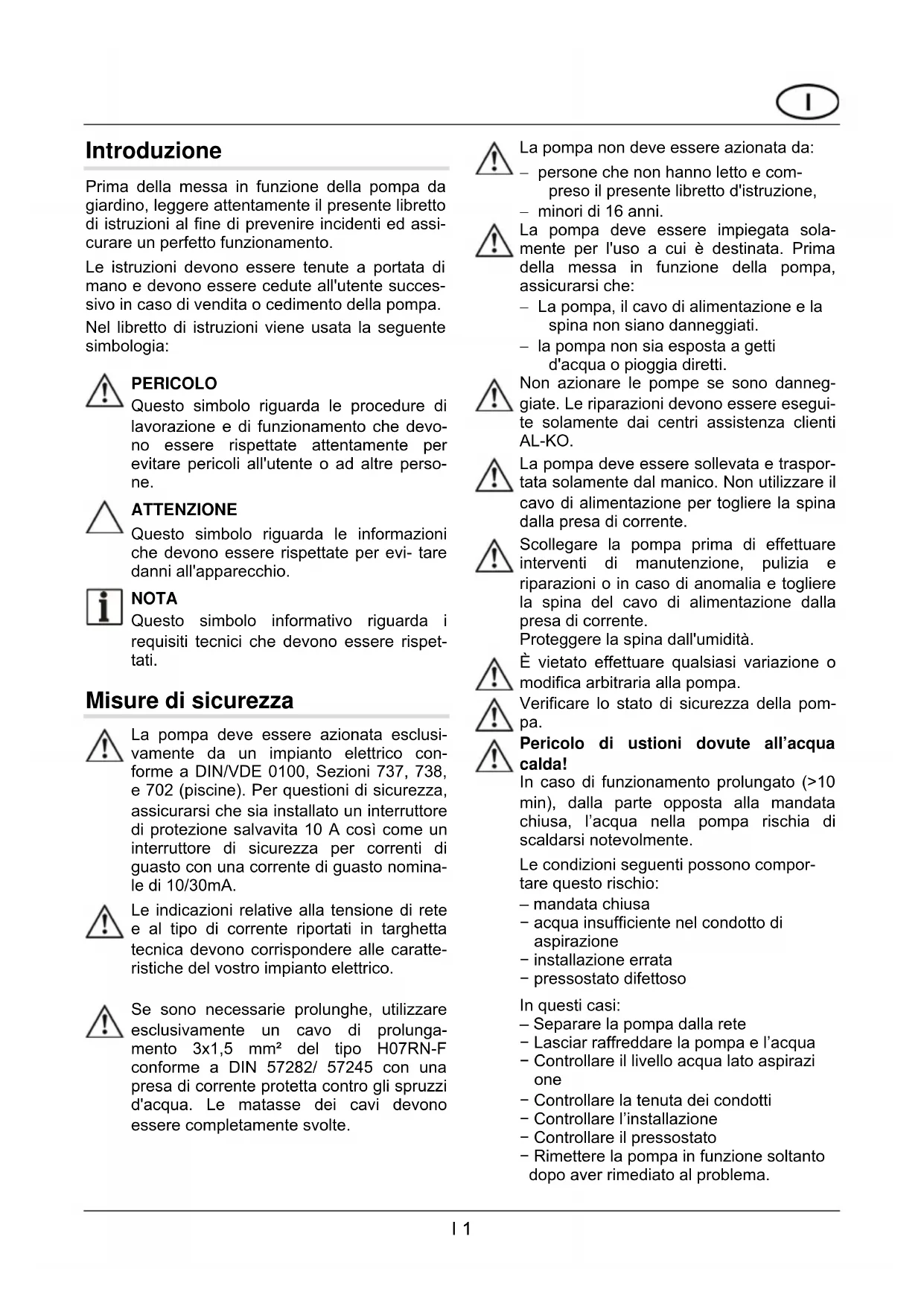 En cas d’anomalies persistantes, s’adresser au Centre Service Après-vente agrée AL-KO le plus proche. F 4Introduzione Prima della messa in funzione della pompa da giardino, leggere attentamente il presente libretto di istruzioni al fine di prevenire incidenti ed assi- curare un perfetto funzionamento. Le istruzioni devono essere tenute a portata di mano e devono essere cedute all'utente succes- sivo in caso di vendita o cedimento della pompa. Nel libretto di istruzioni viene usata la seguente simbologia: