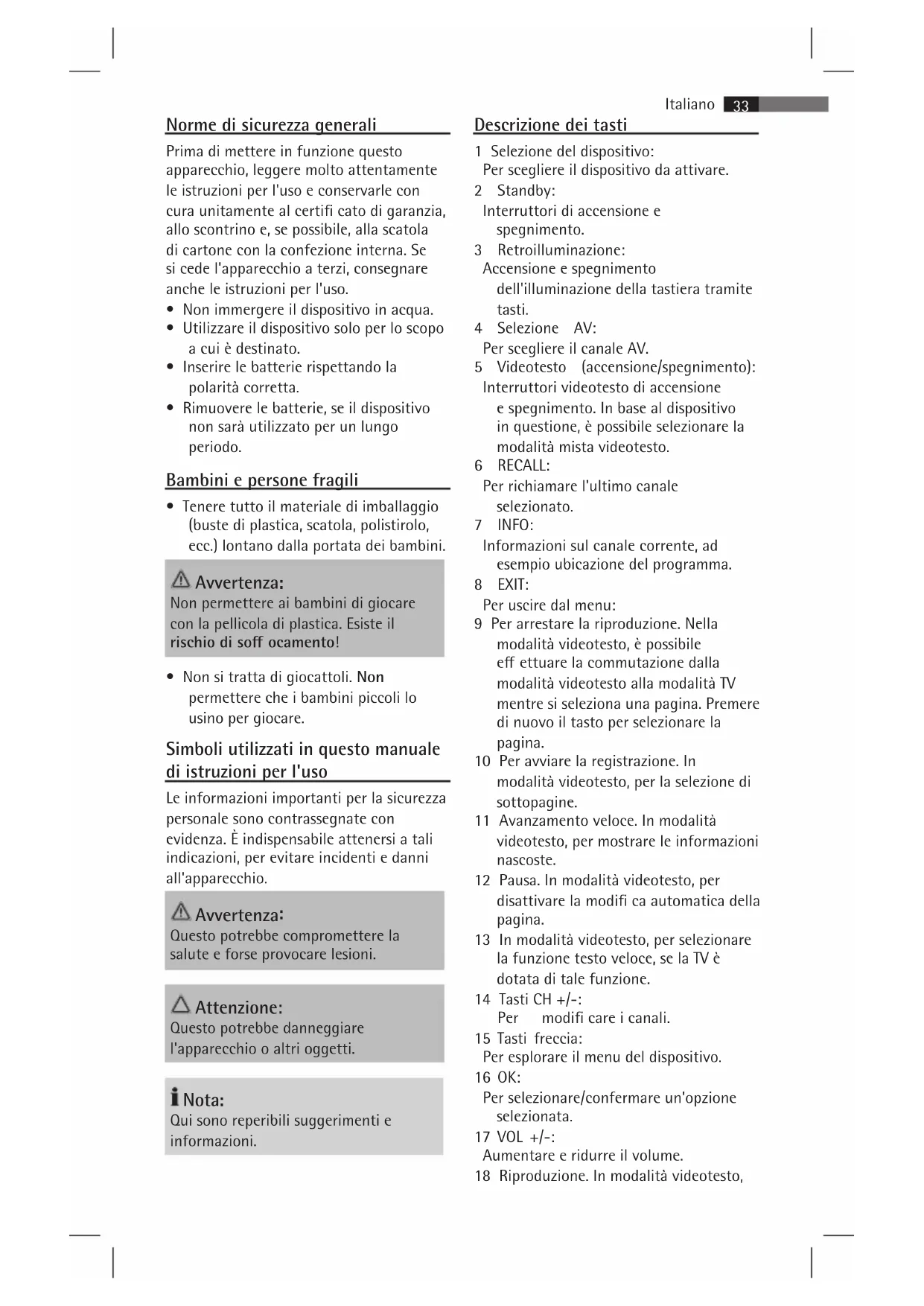 Scarica le istruzioni per il tuo Telecomando in formato PDF gratuitamente! Trova il tuo manuale RC 4000 - AEG e riprendi in mano il tuo dispositivo elettronico. In questa pagina sono pubblicati tutti i documenti necessari per l'utilizzo del tuo dispositivo. RC 4000 del marchio AEG.