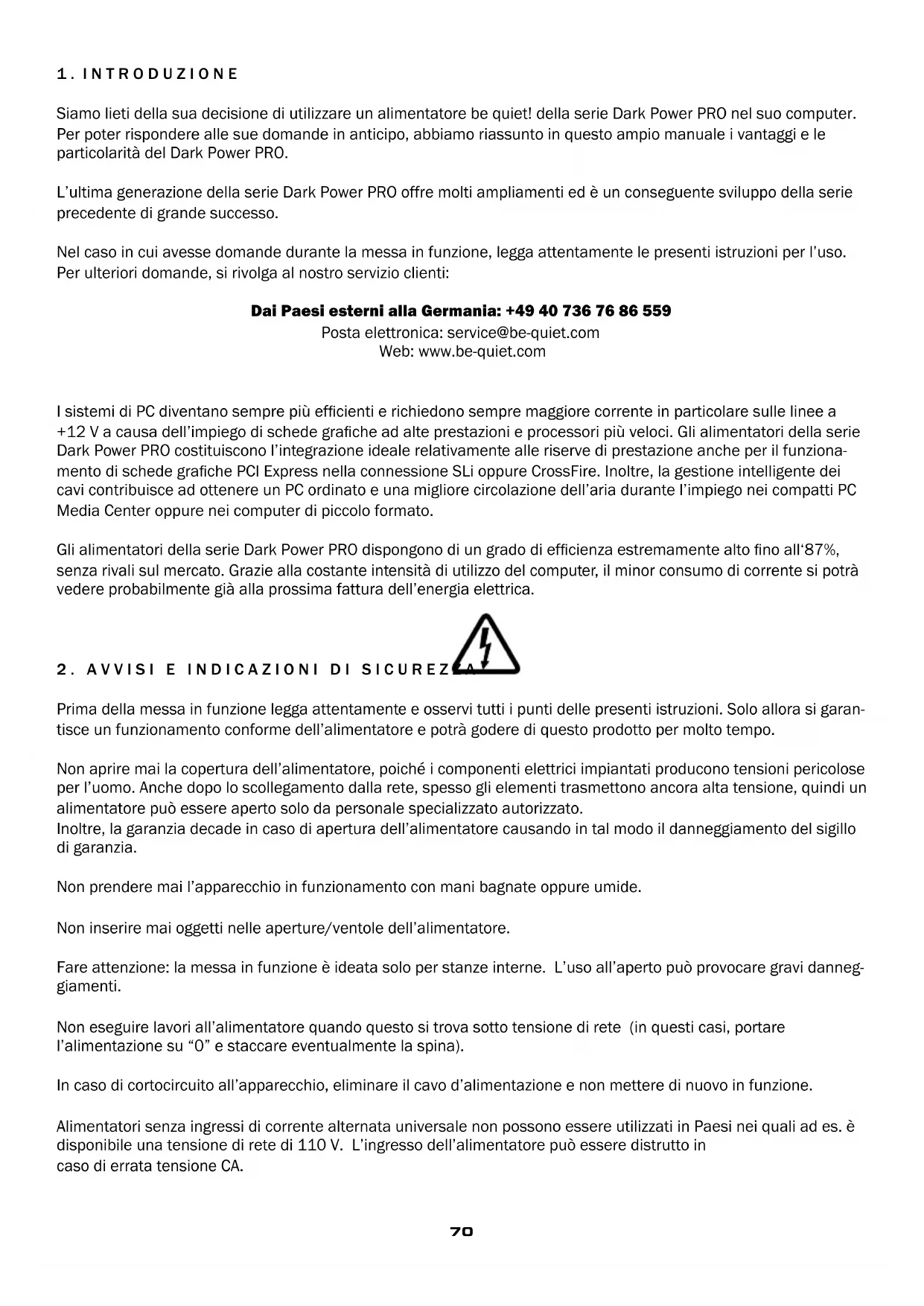 garantía, ni expresa ni tácitamente, de la corrección o totalidad del contenido de esta documentación, inclusive, pero no limitado a la garantía tácita de la adaptación al mercado y la compatibilidad para un n determinado, a no ser que una ley aplicable o jurisdicción prescriban una responsabilidad. Listan se reserva el derecho de realizar modicaciones en este documento en cualquier momento, y de retirar esta documentación.70 1 . I N T R O D U Z I O N E Siamo lieti della sua decisione di utilizzare un alimentatore be quiet! della serie Dark Power PRO nel suo computer. Per poter rispondere alle sue domande in anticipo, abbiamo riassunto in questo ampio manuale i vantaggi e le particolarità del Dark Power PRO. L’ultima generazione della serie Dark Power PRO offre molti ampliamenti ed è un conseguente sviluppo della serie precedente di grande successo. Nel caso in cui avesse domande durante la messa in funzione, legga attentamente le presenti istruzioni per l’uso. Per ulteriori domande, si rivolga al nostro servizio clienti: Dai Paesi esterni alla Germania: +49 40 736 76 86 559 Posta elettronica: service@be-quiet.com Web: www.be-quiet.com I sistemi di PC diventano sempre più efcienti e richiedono sempre maggiore corrente in particolare sulle linee a +12 V a causa dell’impiego di schede grache ad alte prestazioni e processori più veloci. Gli alimentatori della serie Dark Power PRO costituiscono l’integrazione ideale relativamente alle riserve di prestazione anche per il funziona- mento di schede grache PCI Express nella connessione SLi oppure CrossFire. Inoltre, la gestione intelligente dei cavi contribuisce ad ottenere un PC ordinato e una migliore circolazione dell’aria durante l’impiego nei compatti PC Media Center oppure nei computer di piccolo formato. Gli alimentatori della serie Dark Power PRO dispongono di un grado di efcienza estremamente alto no all‘87%, senza rivali sul mercato. Grazie alla costante intensità di utilizzo del computer, il minor consumo di corrente si potrà vedere probabilmente già alla prossima fattura dell’energia elettrica. 2 . A V V I S I E I N D I C A Z I O N I D I S I C U R E Z Z A Prima della messa in funzione legga attentamente e osservi tutti i punti delle presenti istruzioni. Solo allora si garan- tisce un funzionamento conforme dell’alimentatore e potrà godere di questo prodotto per molto tempo. Non aprire mai la copertura dell’alimentatore, poiché i componenti elettrici impiantati producono tensioni pericolose per l’uomo. Anche dopo lo scollegamento dalla rete, spesso gli elementi trasmettono ancora alta tensione, quindi un alimentatore può essere aperto solo da personale specializzato autorizzato. Inoltre, la garanzia decade in caso di apertura dell’alimentatore causando in tal modo il danneggiamento del sigillo di garanzia. Non prendere mai l’apparecchio in funzionamento con mani bagnate oppure umide. Non inserire mai oggetti nelle aperture/ventole dell’alimentatore. Fare attenzione: la messa in funzione è ideata solo per stanze interne. L’uso all’aperto può provocare gravi danneg- giamenti. Non eseguire lavori all’alimentatore quando questo si trova sotto tensione di rete (in questi casi, portare l’alimentazione su “0” e staccare eventualmente la spina). In caso di cortocircuito all’apparecchio, eliminare il cavo d’alimentazione e non mettere di nuovo in funzione. Alimentatori senza ingressi di corrente alternata universale non possono essere utilizzati in Paesi nei quali ad es. è disponibile una tensione di rete di 110 V. L’ingresso dell’alimentatore può essere distrutto in caso di errata tensione CA.71 Tale alimentatore è predisposto per una gamma di tensione tra 100 e 240 V e quindi è utilizzabile in modo univer- sale. Accertarsi che il PC non venga messo in funzione direttamente accanto ad un riscaldamento oppure un’altra fonte di calore, poiché in tal modo viene ridotta la durata di tutti i componenti e si possono vericare avarie. Accertarsi che nell’alloggiamento del computer sia presente sufciente aerazione, ad es. con ventole supplemen- tari, in quanto non compete esclusivamente ad un alimentatore attuale ATX di rimuovere tutto il calore prodotto nell’alloggiamento del PC. Per la pulizia dell’alimentatore, separarlo completamente dalla rete elettrica e non utilizzare panni umidi né deter- genti. Pulire l’alimentatore solo dall’esterno per mezzo di un panno asciutto. Mettere l’alimentatore in funzione solo dopo un’ora in un ambiente aerato, in quanto si potrebbe altrimenti formare acqua di condensa all’interno dell’alimentatore. 3 . VA N TAG G I E PA R T I C O L A R I T à D E L N U O V O A L I M E N TATO R E ELEVATA EFFICIENZA (LIVELLO DI EFFICACIA): Gli alimentatori della serie Dark Power PRO dispongono di un’efcienza molto elevata. Ciò contribuisce a ridurre le spese elettriche annue dovute ad uso frequente. Un’elevata efcienza signica che l’alimentatore può commutare la corrente alternata in ingresso con una minor perdita di corrente continua. Ciò comporta che può vericarsi minore perdita termica il che, a sua volta, ha effetti positivi sul raffreddamento dell’alimentatore. Alimentatori ad elevata efcienza, come dimostra in particolare la serie Dark Power PRO, possono essere attivati con una ventola a rotazione piuttosto lenta e quindi molto silenziosa. Questo sviluppo tecnico continuo offre una rumorosità estremamente bassa. ECONOMICO: Gli alimentatori della serie Dark Power PRO corrispondono alle Direttive attuali 2002/95/CE (RoHS e WEEE) dell’Unione Europea. Una modalità di produzione ecologica e l’impiego di materiali che non contengono agenti inquinanti pericolosi per l‘ambiente sono garantiti nei prodotti be quiet!. In tal modo, noi come produttore e lei come consumatore diamo attivamente un contributo importante alla protezione del nostro ambiente. STABILITà DI TENSIONE: Alimentatori della serie Dark Power PRO dispongon