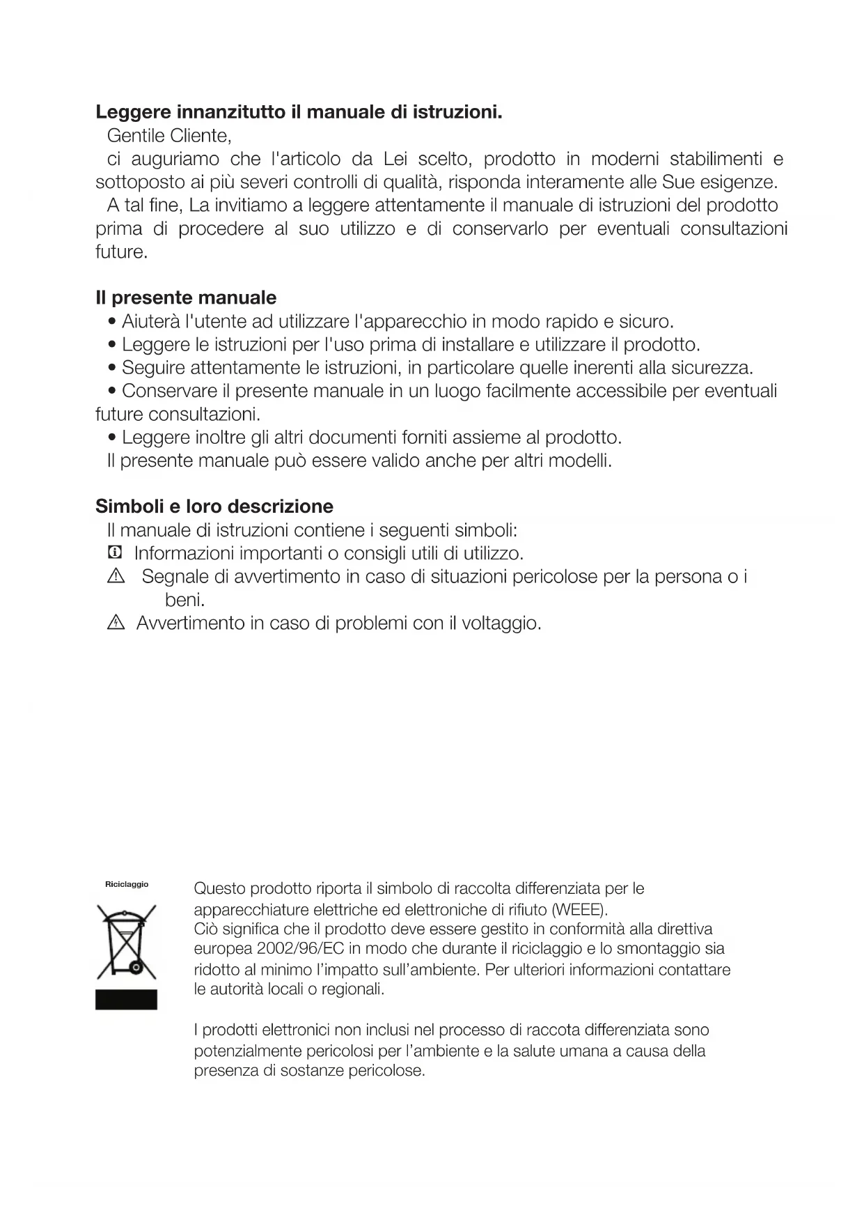 A tal fine, La invitiamo a leggere attentamente il manuale di istruzioni del prodotto