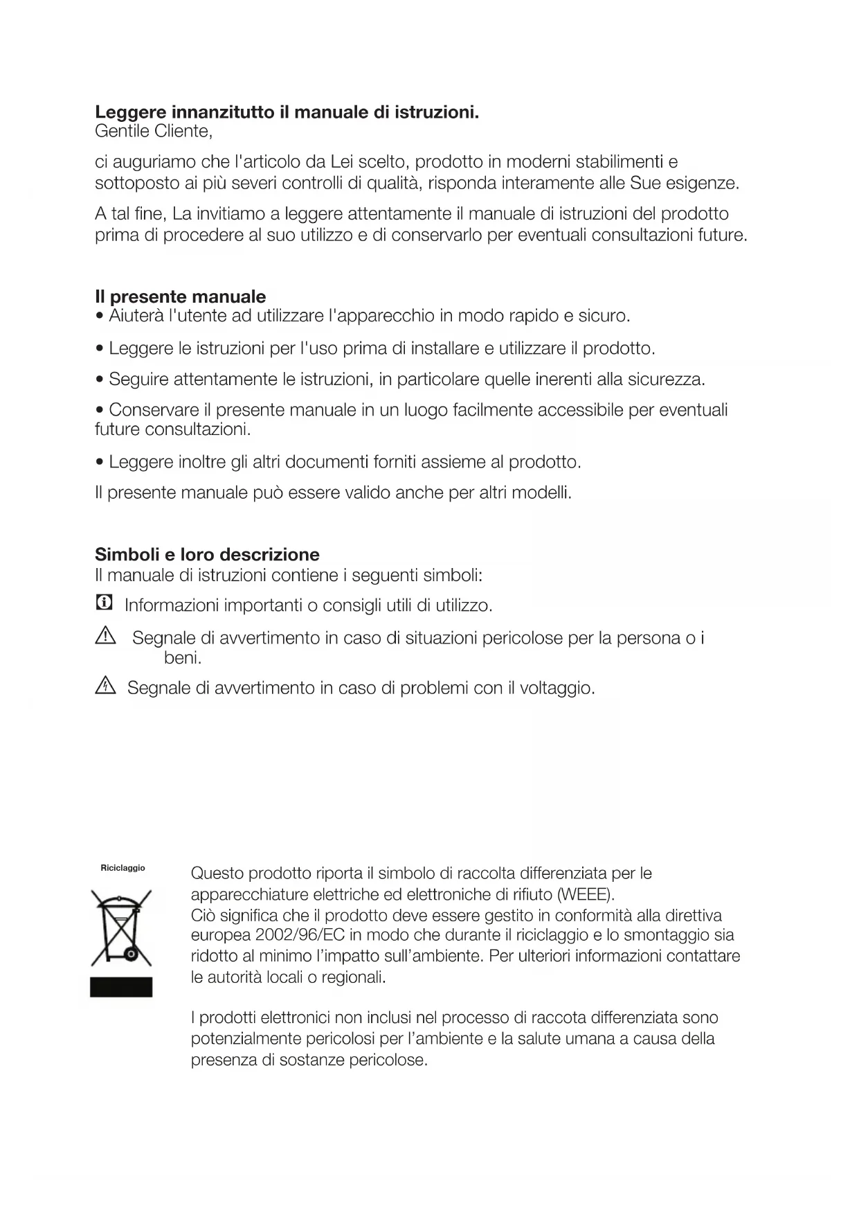 A tal fine, La invitiamo a leggere attentamente il manuale di istruzioni del prodotto