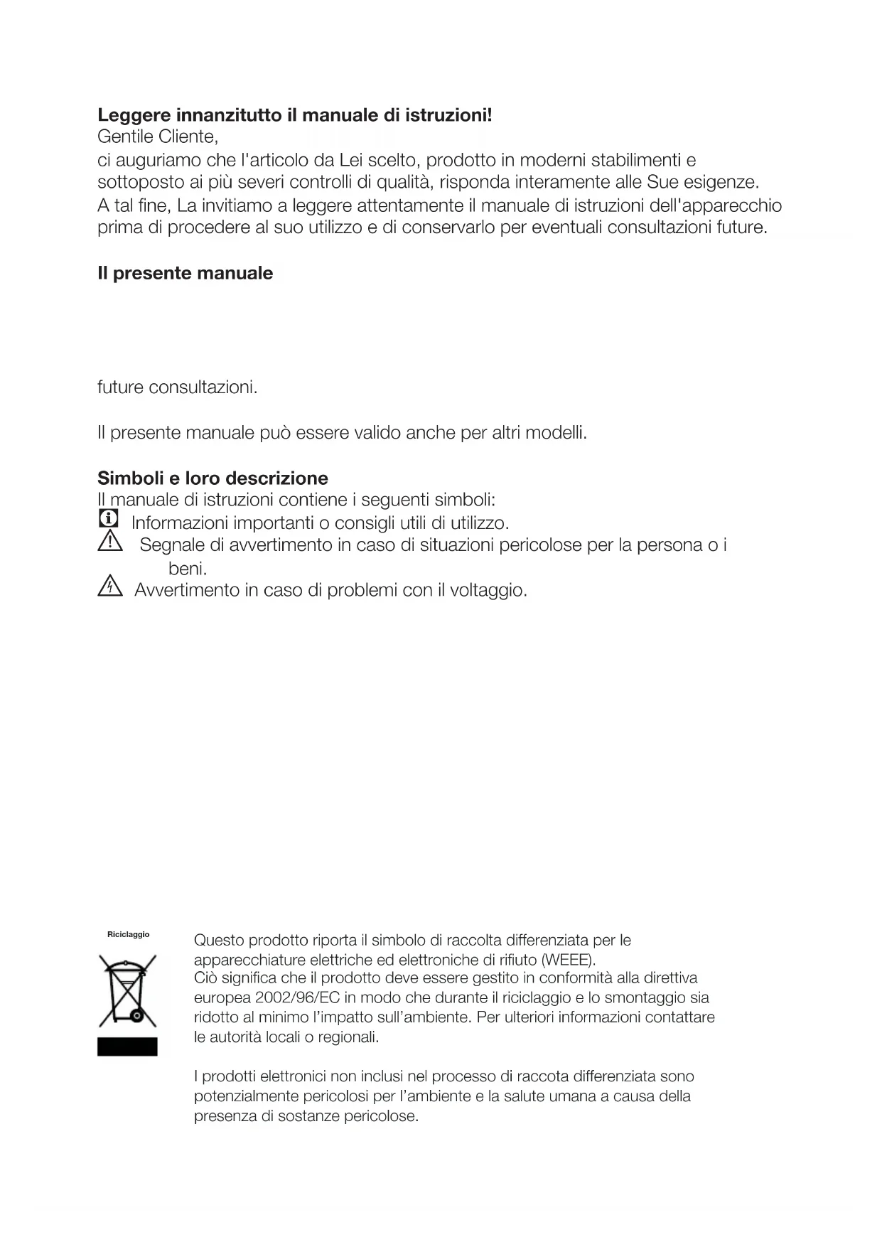 A tal fine, La invitiamo a leggere attentamente il manuale di istruzioni dell'apparecchio