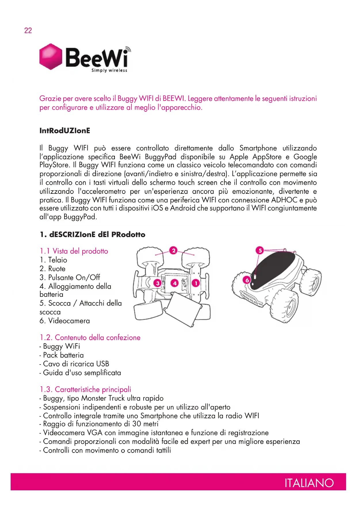1.2. Contenuto della confezione - Buggy WiFi - Pack batteria - Cavo di ricarica USB - Guida d'uso semplificata 1.3. Caratteristiche principali - Buggy, tipo Monster Truck ultra rapido - Sospensioni indipendenti e robuste per un utilizzo all'aperto - Controllo integrale tramite uno Smartphone che utilizza la radio WIFI - Raggio di funzionamento di 30 metri - Videocamera VGA con immagine istantanea e funzione di registrazione - Comandi proporzionali con modalità facile ed expert per una migliore esperienza - Controlli con movimento o comandi tattili Grazie per avere scelto il Buggy WIFI di BEEWI. Leggere attentamente le seguenti istruzioni per configurare e utilizzare al meglio l'apparecchio.