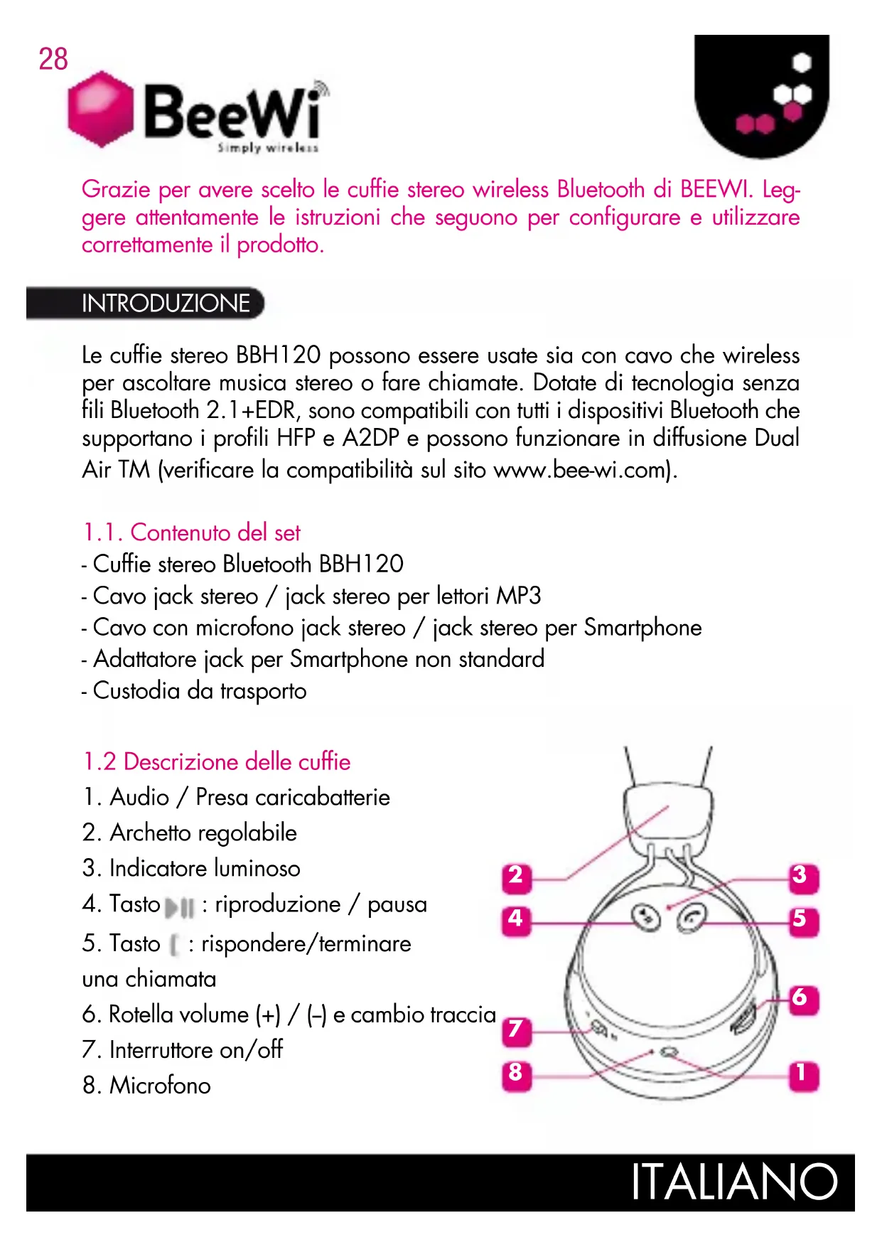 INTRODUZIONE Grazie per avere scelto le cuffie stereo wireless Bluetooth di BEEWI. Leg- gere attentamente le istruzioni che seguono per configurare e utilizzare correttamente il prodotto. ITALIANO