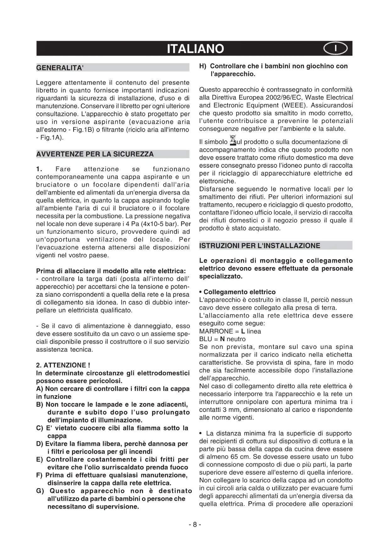 In determinate circostanze gli elettrodomestici possono essere pericolosi. A) Non cercare di controllare i filtri con la cappa in funzione B) Non toccare le lampade e le zone adiacenti, durante e subito dopo l’uso prolungato dell'impianto di illuminazione. C) E' vietato cuocere cibi alla fiamma sotto la cappa D) Evitare la fiamma libera, perchè dannosa per i filtri e pericolosa per gli incendi E) Controllare costantemente i cibi fritti per evitare che l'olio surriscaldato prenda fuoco F) Prima di effettuare qualsiasi manutenzione, disinserire la cappa dalla rete elettrica. G) Questo apparecchio non è destinato all'utilizzo da parte di bambini o persone che necessitano di supervisione. H) Controllare che i bambini non giochino con l'apparecchio. Questo apparecchio è contrassegnato in conformità alla Direttiva Europea 2002/96/EC, Waste Electrical and Electronic Equipment (WEEE). Assicurandosi che questo prodotto sia smaltito in modo corretto, l’utente contribuisce a prevenire le potenziali conseguenze negative per l’ambiente e la salute. Il simbolo sul prodotto o sulla documentazione di accompagnamento indica che questo prodotto non deve essere trattato come rifiuto domestico ma deve essere consegnato presso l’idoneo punto di raccolta per il riciclaggio di apparecchiature elettriche ed elettroniche. Disfarsene seguendo le normative locali per lo smaltimento dei rifiuti. Per ulteriori informazioni sul trattamento, recupero e riciclaggio di questo prodotto, contattare l’idoneo ufficio locale, il servizio di raccolta dei rifiuti domestici o il negozio presso il quale il prodotto è stato acquistato.