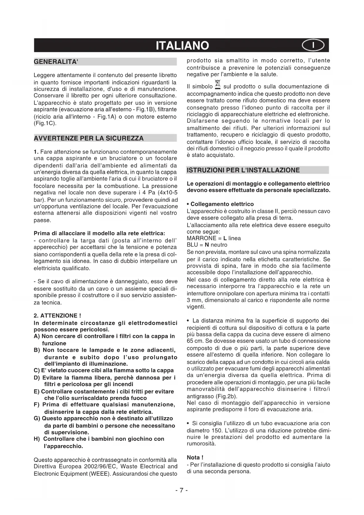 In determinate circostanze gli elettrodomestici possono essere pericolosi. A) Non cercare di controllare i filtri con la cappa in funzione B) Non toccare le lampade e le zone adiacenti, durante e subito dopo l’uso prolungato dell'impianto di illuminazione. C) E' vietato cuocere cibi alla fiamma sotto la cappa D) Evitare la fiamma libera, perchè dannosa per i filtri e pericolosa per gli incendi E) Controllare costantemente i cibi fritti per evitare che l'olio surriscaldato prenda fuoco F) Prima di effettuare qualsiasi manutenzione, disinserire la cappa dalla rete elettrica. G) Questo apparecchio non è destinato all'utilizzo da parte di bambini o persone che necessitano di supervisione. H) Controllare che i bambini non giochino con l'apparecchio. Questo apparecchio è contrassegnato in conformità alla Direttiva Europea 2002/96/EC, Waste Electrical and Electronic Equipment (WEEE). Assicurandosi che questo prodotto sia smaltito in modo corretto, l’utente contribuisce a prevenire le potenziali conseguenze negative per l’ambiente e la salute. Il simbolo sul prodotto o sulla documentazione di accompagnamento indica che questo prodotto non deve essere trattato come rifiuto domestico ma deve essere consegnato presso l’idoneo punto di raccolta per il riciclaggio di apparecchiature elettriche ed elettroniche. Disfarsene seguendo le normative locali per lo smaltimento dei rifiuti. Per ulteriori informazioni sul trattamento, recupero e riciclaggio di questo prodotto, contattare l’idoneo ufficio locale, il servizio di raccolta dei rifiuti domestici o il negozio presso il quale il prodotto è stato acquistato.