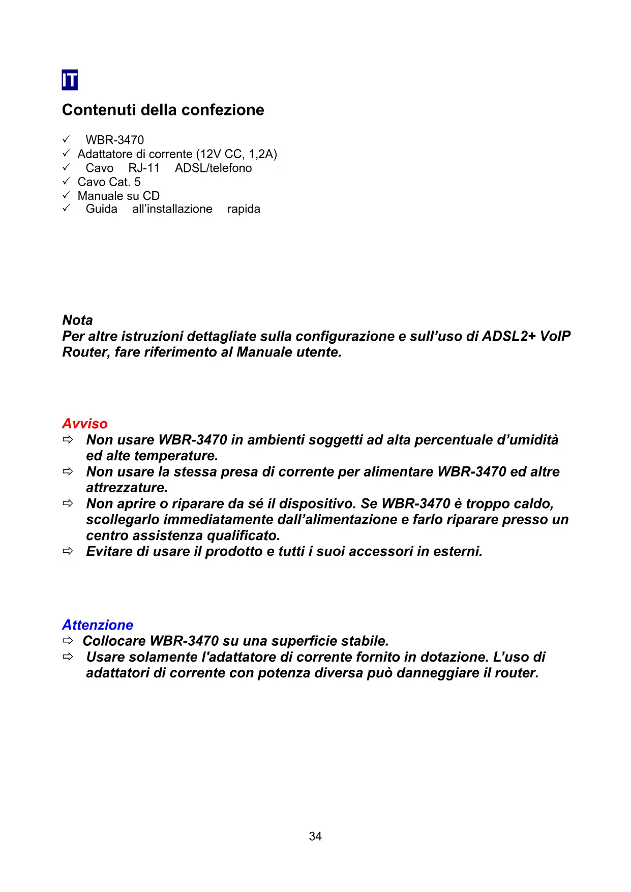 33IT Contenuti della confezione 3 WBR-3470 3 Adattatore di corrente (12V CC, 1,2A) 3 Cavo RJ-11 ADSL/telefono 3 Cavo Cat. 5 3 Manuale su CD 3 Guida all’installazione rapida