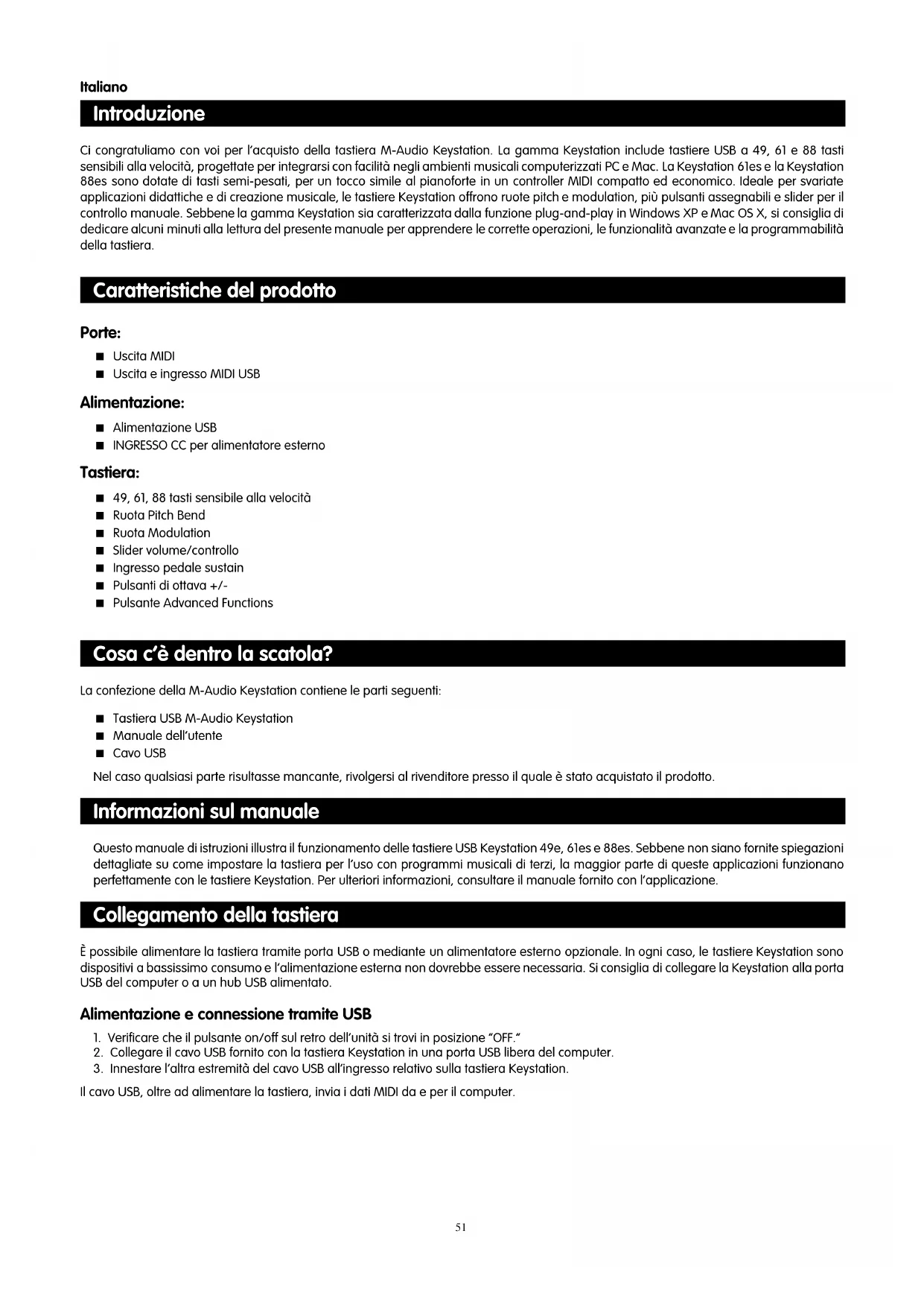 - Mensajes SysEx (para más detalles ** Mensajes SysEx MMC (para más detalles *** No es posible introducir este valor mediante el teclado numérico. Teclee 144 y a continuación pulse el botón Preset + para definir este valor.5051 Introduzione Ci congratuliamo con voi per l’acquisto della tastiera M-Audio Keystation. La gamma Keystation include tastiere USB a 49, 61 e 88 tasti sensibili alla velocità, progettate per integrarsi con facilità negli ambienti musicali computerizzati PC e Mac. La Keystation 61es e la Keystation 88es sono dotate di tasti semi-pesati, per un tocco simile al pianoforte in un controller MIDI compatto ed economico. Ideale per svariate applicazioni didattiche e di creazione musicale, le tastiere Keystation offrono ruote pitch e modulation, più pulsanti assegnabili e slider per il controllo manuale. Sebbene la gamma Keystation sia caratterizzata dalla funzione plug-and-play in Windows XP e Mac OS X, si consiglia di dedicare alcuni minuti alla lettura del presente manuale per apprendere le corrette operazioni, le funzionalità avanzate e la programmabilità della tastiera. Caratteristiche del prodotto Porte: < Uscita MIDI < Uscita e ingresso MIDI USB Alimentazione: < Alimentazione USB < INGRESSO CC per alimentatore esterno Tastiera: < 49, 61, 88 tasti sensibile alla velocità < Ruota Pitch Bend < Ruota Modulation < Slider volume/controllo < Ingresso pedale sustain < Pulsanti di ottava +/- < Pulsante Advanced Functions Cosa c’è dentro la scatola? La confezione della M-Audio Keystation contiene le parti seguenti: < Tastiera USB M-Audio Keystation < Manuale dell’utente < Cavo USB Nel caso qualsiasi parte risultasse mancante, rivolgersi al rivenditore presso il quale è stato acquistato il prodotto. Informazioni sul manuale Questo manuale di istruzioni illustra il funzionamento delle tastiere USB Keystation 49e, 61es e 88es. Sebbene non siano fornite spiegazioni dettagliate su come impostare la tastiera per l’uso con programmi musicali di terzi, la maggior parte di queste applicazioni funzionano perfettamente con le tastiere Keystation. Per ulteriori informazioni, consultare il manuale fornito con l’applicazione. Collegamento della tastiera È possibile alimentare la tastiera tramite porta USB o mediante un alimentatore esterno opzionale. In ogni caso, le tastiere Keystation sono dispositivi a bassissimo consumo e l’alimentazione esterna non dovrebbe essere necessaria. Si consiglia di collegare la Keystation alla porta USB del computer o a un hub USB alimentato. Alimentazione e connessione tramite USB