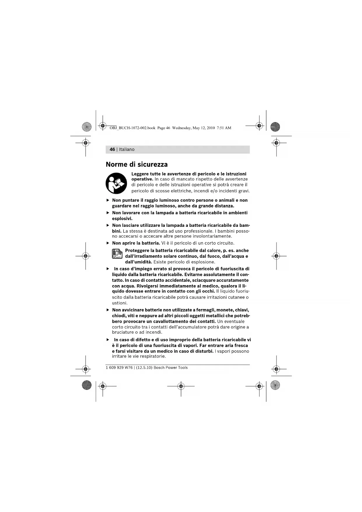 Norme di sicurezza Leggere tutte le avvertenze di pericolo e le istruzioni operative. In caso di mancato rispetto delle avvertenze di pericolo e delle istruzioni operative si potrà creare il pericolo di scosse elettriche, incendi e/o incidenti gravi. f Non puntare il raggio luminoso contro persone o animali e non guardare nel raggio luminoso, anche da grande distanza. f Non lavorare con la lampada a batteria ricaricabile in ambienti esplosivi. f Non lasciare utilizzare la lampada a batteria ricaricabile da bam- bini. La stessa è destinata ad uso professionale. I bambini posso- no accecarsi o accecare altre persone involontariamente. f Non aprire la batteria. Vi è il pericolo di un corto circuito. Proteggere la batteria ricaricabile dal calore, p. es. anche dall’irradiamento solare continuo, dal fuoco, dall’acqua e dall’umidità. Esiste pericolo di esplosione. f In caso d’impiego errato si provoca il pericolo di fuoriuscita di liquido dalla batteria ricaricabile. Evitarne assolutamente il con- tatto. In caso di contatto accidentale, sciacquare accuratamente con acqua. Rivolgersi immediatamente al medico, qualora il li- quido dovesse entrare in contatto con gli occhi. Il liquido fuoriu- scito dalla batteria ricaricabile potrà causare irritazioni cutanee o ustioni. f Non avvicinare batterie non utilizzate a fermagli, monete, chiavi, chiodi, viti e neppure ad altri piccoli oggetti metallici che potreb- bero provocare un cavallottamento dei contatti. Un eventuale corto circuito tra i contatti dell’accumulatore potrà dare origine a bruciature o ad incendi. f In caso di difetto e di uso improprio della batteria ricaricabile vi è il pericolo di una fuoriuscita di vapori. Far entrare aria fresca e farsi visitare da un medico in caso di disturbi. I vapori possono irritare le vie respiratorie. OBJ_BUCH-1072-002.book Page 46 Wednesday, May 12, 2010 7:51 AMItaliano | 47 Bosch Power Tools 1 609 929 W76 | (12.5.10) f Caricare la batteria ricaricabile solo ed esclusivamente nei disposi- tivi di carica consigliati dal produttore. Per un dispositivo di carica previsto per un determinato tipo di batteria sussiste pericolo di in- cendio se viene utilizzato con un tipo diverso di batteria ricaricabile. f Utilizzare la batteria ricaricabile esclusivamente insieme all’elettroutensile Bosch. Solo in questo modo la batteria ricari- cabile viene protetta da sovraccarico pericoloso. f Utilizzare esclusivamente batterie ricaricabili originali Bosch dotate della tensione indicata sulla targhetta di identificazione dell’elettroutensile. In caso di impiego di altre batterie ricaricabi- li, p. es. imitazioni, batterie ricaricabili rigenerate oppure prodotti di terzi, esiste il pericolo di lesioni e di danni alle cose causate da batterie che esplodono. Descrizione del funzionamento Uso conforme alle norme La lampada a batteria ricaricabile è ideale per l’illuminazione manua- le, limitata di spazi in settori asciutti. Componenti illustrati La numerazione dei componenti illustrati si riferisce all’illustrazione della lampada a batteria sulla pagina con la rappresentazione grafica. 1 Testa della lampada 2 Interruttore di avvio/arresto 3 Batteria ricaricabile* 4 Tasto di sbloccaggio della batteria ricaricabile 5 Clip di aggancio cintura *L’accessorio illustrato oppure descritto non è compreso nel volume di forni- tura standard. L’accessorio completo è contenuto nel nostro programma accessori. OBJ_BUCH-1072-002.book Page 47 Wednesday, May 12, 2010 7:51 AM1 609 929 W76 | (12.5.10) Bosch Power Tools 48 | Italiano Dati tecnici Montaggio Caricare la batteria (accessori) (vedi figura A) f Utilizzare esclusivamente i dispositivi di carica elencati nella pa- gina degli accessori. Solo questi dispositivi di carica corrispondo- no alla batteria ricaricabile Li-Ion utilizzata nella lampada a batte- ria ricaricabile. Nota bene: La batteria ricaricabile viene fornita parzialmente carica. Per garantire l’intera potenza della batteria ricaricabile, prima del pri- mo impiego ricaricare completamente la batteria ricaricabile nella stazione di ricarica. La batteria ricaricabile a ioni di litio può essere ricaricata in qualsiasi momento senza ridurne la durata. Un’interruzione dell’operazione di ricarica non danneggia la batteria ricaricabile. Lampada a batteria ricaricabile GLI 10,8 V-LI Professional Codice prodotto 3 601 D37 U.. Tensione nominale V= 10,8 Autonomia, ca. min 450 Temperatura di esercizio °C – 10 ... +40 Temperatura di magazzino °C – 15 ... +50 Peso in funzione della EPTA-Procedure 01/2003 kg 0,3 Si prega di tenere presente il codice prodotto applicato sulla targhetta della lam- pada a batteria ricaricabile in dotazione. Le descrizioni commerciali di singole lampade a batteria ricaricabile possono variare. OBJ_BUCH-1072-002.book Page 48 Wednesday, May 12, 2010 7:51 AMItaliano | 49 Bosch Power Tools 1 609 929 W76 | (12.5.10) La batteria ricaricabile Li-Ion è protetta dalla «Electronic Cell Protec- tion (ECP)» contro lo scaricamento totale. In caso di batteria ricari- cabile scarica, la lampada a batteria ricaricabile viene spenta tramite un collegamento di protezione. Dopo lo spegnimento automatico della lampada a batteria ricaricabile non continuare a premere l’interruttore di avvio/arresto. La batteria ricaricabile potrebbe venir danneggiata. Per la rimozione della batteria ricaricabile 3 premere il tasto di sbloc- caggio della batteria ricaricabile 4 ed estrarre, tirando verso la parte posteriore. la batteria ricaricabile dalla lampada. Durante questa operazione non sforzare. La batteria ricaricabile è dotata di un sensore NTC per il controllo del- la temperatura che permette operazioni di ricarica solo entro un cam- po di temperatura tra 0 °C e 45 °C. In questo modo si permette di raggiungere una lunga durata della batteria. Si prega di attenersi alle indicazioni relative allo smaltimento. Uso Messa in funzione Applicazione della batteria ricaricabile f Utilizzare esclusiva