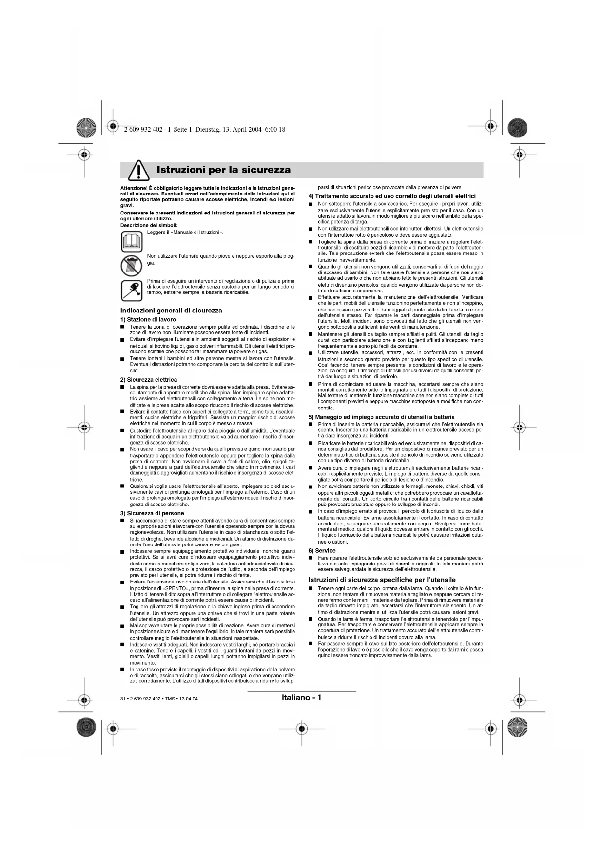 2 609 932 402 - P Seite 5 Dienstag, 13. April 2004 6:00 1830 • 2 609 932 402 • TMS • 13.04.04Italiano - 1 Attenzione! È obbligatorio leggere tutte le indicazioni e le istruzioni gene-rali di sicurezza. Eventuali errori nell’adempimento delle istruzioni qui diseguito riportate potranno causare scosse elettriche, incendi e/o lesionigravi.Conservare le presenti indicazioni ed istruzioni generali di sicurezza perogni ulteriore utilizzo.Descrizione dei simboli: