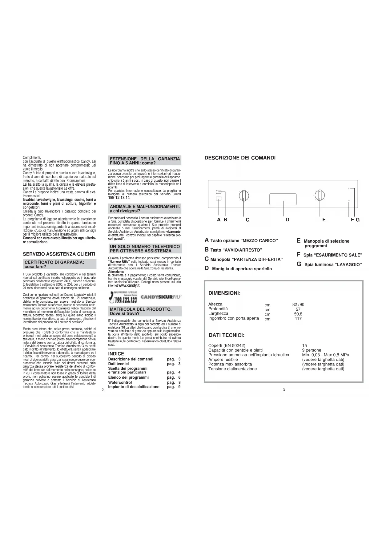 UN SOLO NUMERO TELEFONICO PER OTTENERE ASSISTENZA Qualora il problema dovesse persistere, componendo il“Numero Utile” sotto indicato, sarà messo in contattodirettamente con il Servizio Assistenza TecnicaAutorizzato che opera nella Sua zona di residenza.Attenzione:la chiamata è a pagamento; il costo verrà comunicato,tramite messaggio vocale, dal Servizio clienti dell’opera-tore telefonico utilizzato. Dettagli sono presenti sul sitointernet www.candy.it. MATRICOLA DEL PRODOTTO.