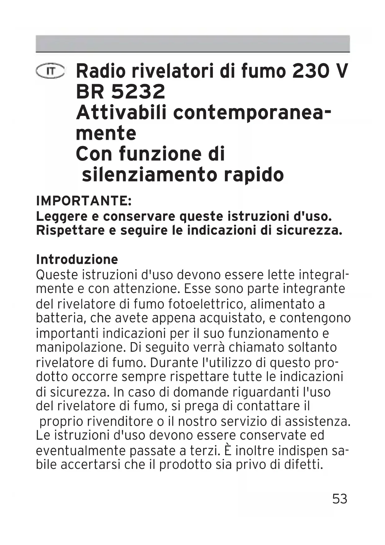 Bedieningshandleiding BR 5232 052109 Rauchmelder BR 5232 02.06.2009 19:19 Uhr53 Radio rivelatori di fumo 230 V BR 5232 Attivabili contemporanea- mente Con funzione di silenziamento rapido IMPORTANTE: Leggere e conservare queste istruzioni d'uso. Rispettare e seguire le indicazioni di sicurezza. Introduzione Queste istruzioni d'uso devono essere lette integral- mente e con attenzione. Esse sono parte integrante del rivelatore di fumo fotoelettrico, alimentato a batteria, che avete appena acquistato, e contengono importanti indicazioni per il suo funzionamento e manipolazione. Di seguito verrà chiamato soltanto rivelatore di fumo. Durante l'utilizzo di questo pro- dotto occorre sempre rispettare tutte le indicazioni di sicurezza. In caso di domande riguardanti l'uso del rivelatore di fumo, si prega di contattare il proprio rivenditore o il nostro servizio di assistenza. Le istruzioni d'uso devono essere conservate ed eventualmente passate a terzi. È inoltre indispen sa- bile accertarsi che il prodotto sia privo di difetti. 052109 Rauchmelder BR 5232 02.06.2009 19:19 UhrDati tecnici Apparecchio: BR 5232 Marchio di controllo: EN 14604 Tipo di protezione: IP 20 Batteria di riserva: zinco carbone 9 V DC (IEC 6F22)/ batteria alcalina (IEC 6LR61) oppure MN1604 In caso di caduta di tensione elettrica, la batteria se ne assume il funzionamento per Amperaggio max: < 20 mA (allarme) Temperatura ambiente: 0°C – 40°C Umidità relativa dell'aria: 10 %- 90 % Potenza segnalatore: 85 dB (a 3 mt di distanza) Durata di vita della batteria: min. 1 anno Interconnessione: max. 12 rivelatori di fu- mo con una lunghezza di cavo di 40 mt max fra i rispettivi apparecchi. Scelta del luogo di montaggio INDICAZIONE: È consigliabile installare più rivelatori di fumo nell'abitazione o nell'edificio.