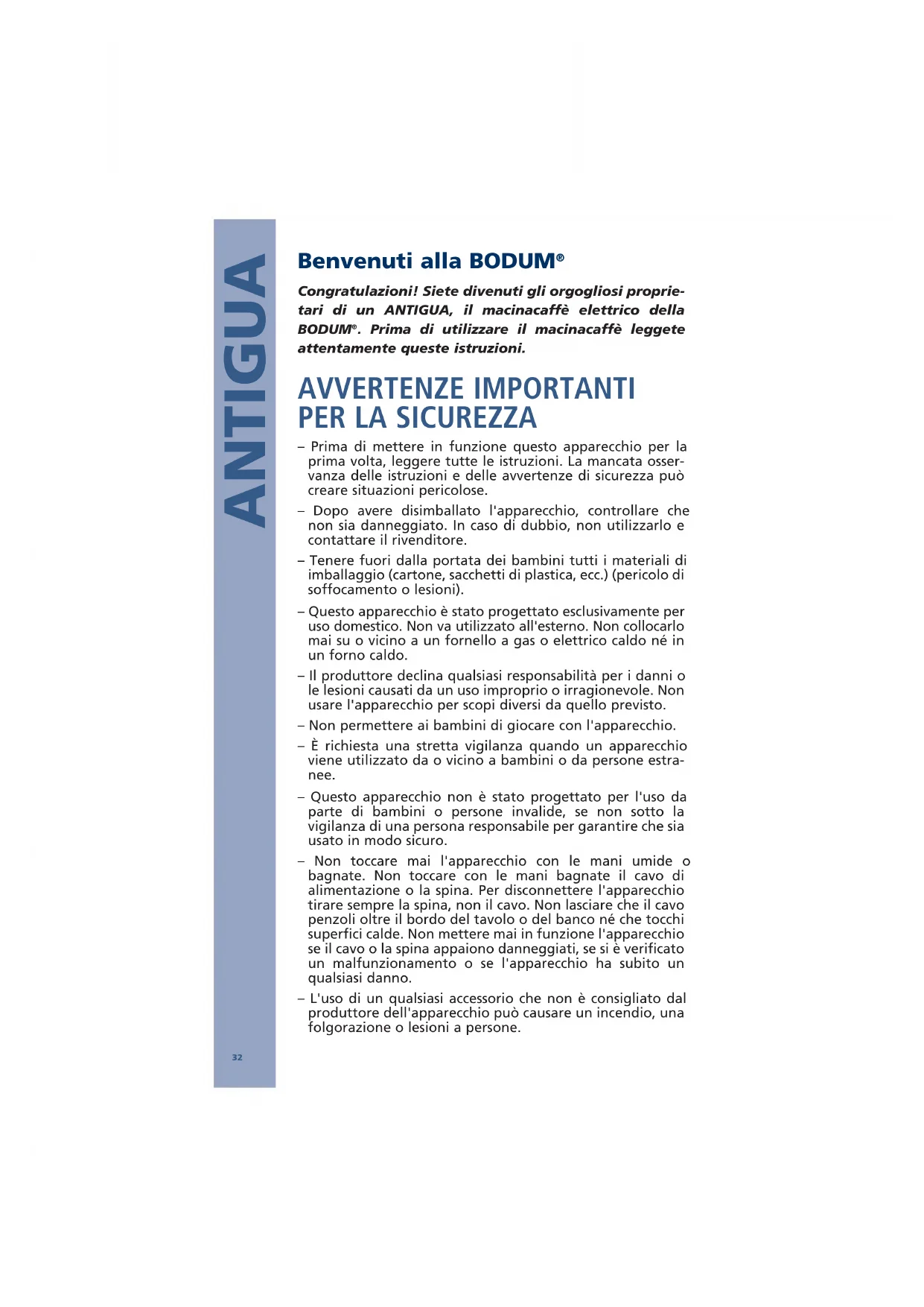 Congratulazioni! Siete divenuti gli orgogliosi proprie- tari di un ANTIGUA, il macinacaffè elettrico della BODUM