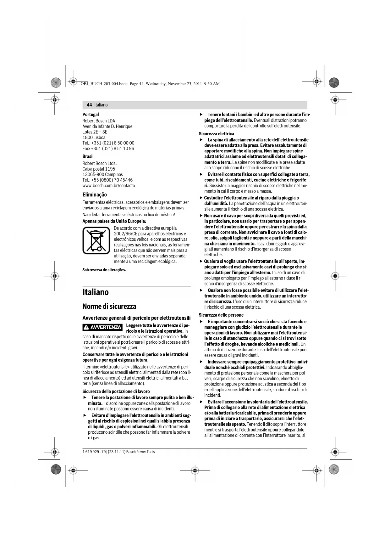 para fixar a profundidade de imersão. – Desatarraxar os parafusos de cabeça embutida 49. Atarra- xar os parafusos de cabeça cilíndrica 48 nos orifícios pre- vistos para tal, de modo que a placa corrediça 9 possar ser movimentada livremente. – Introduzir o punção de centragem 50 na admissão de fer- ramentas, como indicado na figura. Atarraxar manualmen- te a porca de capa, de modo que o punção de centragem ainda possa ser movimentado livremente. – Alinhar o punção de centragem 50 e a manga copiadora 47, um em relação ao outro, deslocando levemente a placa de guia 9. – Apertar os parafusos de cabeça cilíndrica 48. – Remover o punção de centragem 50 da admissão da ferra- menta. – Premir a alavanca de destravamento 22 e conduzir a tupia para a posição superior. Proceda da seguinte maneira para fresar com a manga copia- dora 47: – Conduzir a ferramenta eléctrica ligada, com a manga copi- adora, na direcção do gabarito. – Premir a alavanca de destravamento 22 para baixo e con- duzir a tupia lentamente para baixo, até a fresa alcançar a profundidade de fresagem. Soltar novamente a alavanca de destravamento 22, para fixar a profundidade de imer- são. – Conduzir a ferramenta eléctrica, com a manga copiadora sobressalente, ao longo do gabarito, aplicando pressão la- teral. Manutenção e serviço Manutenção e limpeza f Antes de todos trabalhos na ferramenta eléctrica deve- rá puxar a ficha de rede da tomada. f Manter a ferramenta eléctrica e as aberturas de venti- lação sempre limpas, para trabalhar bem e de forma se- gura. f Em condições de trabalho extremas deverá, se possí- vel, usar sempre um equipamento de aspiração. Soprar frequentemente as aberturas de ventilação e interco- nectar um disjuntor de corrente de avaria. Durante o processamento de metais é possível que se deposite pó condutivo no interior da ferramenta eléctrica. Isto pode prejudicar o isolamento de protecção da ferramenta eléc- trica. Se for necessário substituir o cabo de conexão, isto deverá ser realizado pela Bosch ou por uma oficina de serviço pós- venda autorizada para todas as ferramentas eléctricas Bosch para evitar riscos de segurança. Se a ferramenta eléctrica falhar apesar de cuidadosos proces- sos de fabricação e de teste, a reparação deverá ser executa- da por uma oficina de serviço autorizada para ferramentas eléctricas Bosch. Para todas as questões e encomendas de peças sobressalen- tas é imprescindível indicar o número de produto de 10 dígitos como consta na placa de características da ferra- menta eléctrica. Serviço pós-venda e assistência ao cliente O serviço pós-venda responde às suas perguntas a respeito de serviços de reparação e de manutenção do seu produto, assim como das peças sobressalentes. Desenhos explodidos e informações sobre peças sobressalentes encontram-se em: www.bosch-pt.com A nossa equipa de consultores Bosch esclarece com prazer todas as suas dúvidas a respeito da compra, aplicação e ajus- te dos produtos e acessórios. OBJ_BUCH-203-004.book Page 43 Wednesday, November 23, 2011 9:50 AM44 | Italiano 1 619 929 J79 | (23.11.11) Bosch Power Tools Portugal Robert Bosch LDA Avenida Infante D. Henrique Lotes 2E – 3E 1800 Lisboa Tel.: +351 (021) 8 50 00 00 Fax: +351 (021) 8 51 10 96 Brasil Robert Bosch Ltda. Caixa postal 1195 13065-900 Campinas Tel.: +55 (0800) 70 45446 www.bosch.com.br/contacto Eliminação Ferramentas eléctricas, acessórios e embalagens devem ser enviados a uma reciclagem ecológica de matérias primas. Não deitar ferramentas eléctricas no lixo doméstico! Apenas países da União Europeia: De acordo com a directiva européia 2002/96/CE para aparelhos eléctricos e electrónicos velhos, e com as respectivas realizações nas leis nacionais, as ferramen- tas eléctricas que não servem mais para a utilização, devem ser enviadas separada- mente a uma reciclagem ecológica. Sob reserva de alterações. Italiano Norme di sicurezza Avvertenze generali di pericolo per elettroutensili Leggere tutte le avvertenze di pe- ricolo e le istruzioni operative. In caso di mancato rispetto delle avvertenze di pericolo e delle istruzioni operative si potrà creare il pericolo di scosse elettri- che, incendi e/o incidenti gravi. Conservare tutte le avvertenze di pericolo e le istruzioni operative per ogni esigenza futura. Il termine «elettroutensile» utilizzato nelle avvertenze di peri- colo si riferisce ad utensili elettrici alimentati dalla rete (con li- nea di allacciamento) ed ad utensili elettrici alimentati a bat- teria (senza linea di allacciamento). Sicurezza della postazione di lavoro f Tenere la postazione di lavoro sempre pulita e ben illu- minata. Il disordine oppure zone della postazione di lavoro non illuminate possono essere causa di incidenti. f Evitare d’impiegare l’elettroutensile in ambienti sog- getti al rischio di esplosioni nei quali si abbia presenza di liquidi, gas o polveri infiammabili. Gli elettroutensili producono scintille che possono far infiammare la polvere o i gas. f Tenere lontani i bambini ed altre persone durante l’im- piego dell’elettroutensile. Eventuali distrazioni potranno comportare la perdita del controllo sull’elettroutensile. Sicurezza elettrica f La spina di allacciamento alla rete dell’elettroutensile deve essere adatta alla presa. Evitare assolutamente di apportare modifiche alla spina. Non impiegare spine adattatrici assieme ad elettroutensili dotati di collega- mento a terra. Le spine non modificate e le prese adatte allo scopo riducono il rischio di scosse elettriche. f Evitare il contatto fisico con superfici collegate a terra, come tubi, riscaldamenti, cucine elettriche e frigorife- ri. Sussiste un maggior rischio di scosse elettriche nel mo- mento in cui il corpo è messo a massa. f Custodire l’elettroutensile al riparo dalla pioggia o dall’umidità. La penetrazione dell’acqua in un elettrouten- sile aumenta il 