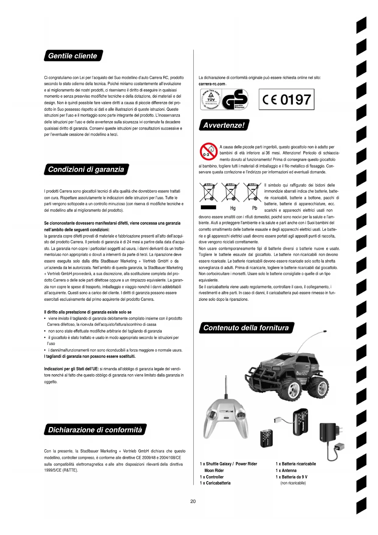 - i danni/malfunzionamenti non sono riconducibili a forza maggiore o normale usura. I tagliandi di garanzia non possono essere sostituiti. Indicazioni per gli Stati dell’UE: si rimanda all’obbligo di garanzia legale del vendi- tore nonché al fatto che questo obbligo di garanzia non viene limitato dalla garanzia in oggetto. Dichiarazione di conformità Con la presente, la Stadlbauer Marketing + Vertrieb GmbH dichiara che questo modellino, controller compreso, è conforme alle direttive CE 2009/48 e 2004/108/CE sulla compatibilità elettromagnetica e alle altre disposizioni rilevanti della direttiva 1999/5/CE (R&TTE). La dichiarazione di conformità originale può essere richiesta online nel sito: carrerarc.com
