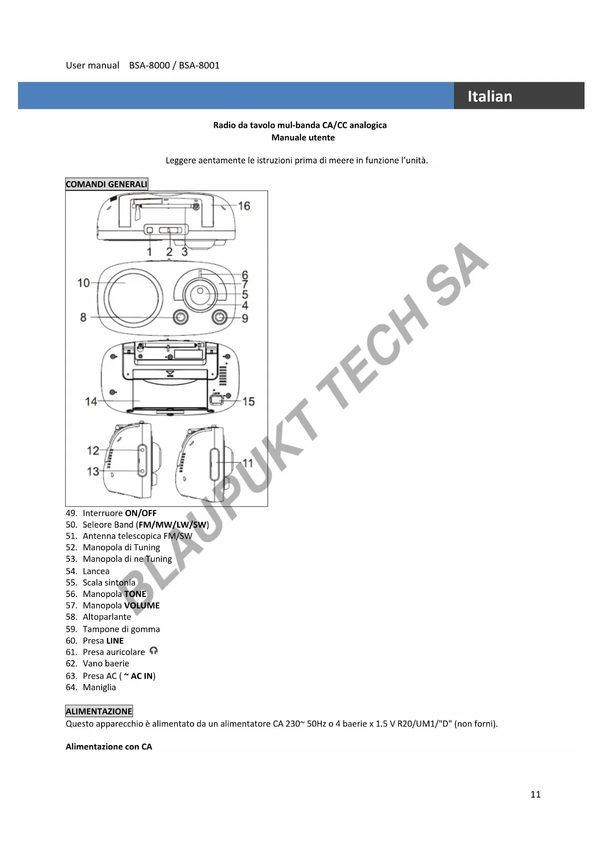 ALIMENTAZIONE Questo apparecchio è alimentato da un alimentatore CA 230~ 50Hz o 4 batterie x 1.5 V R20/UM1/"D" (non forniti).