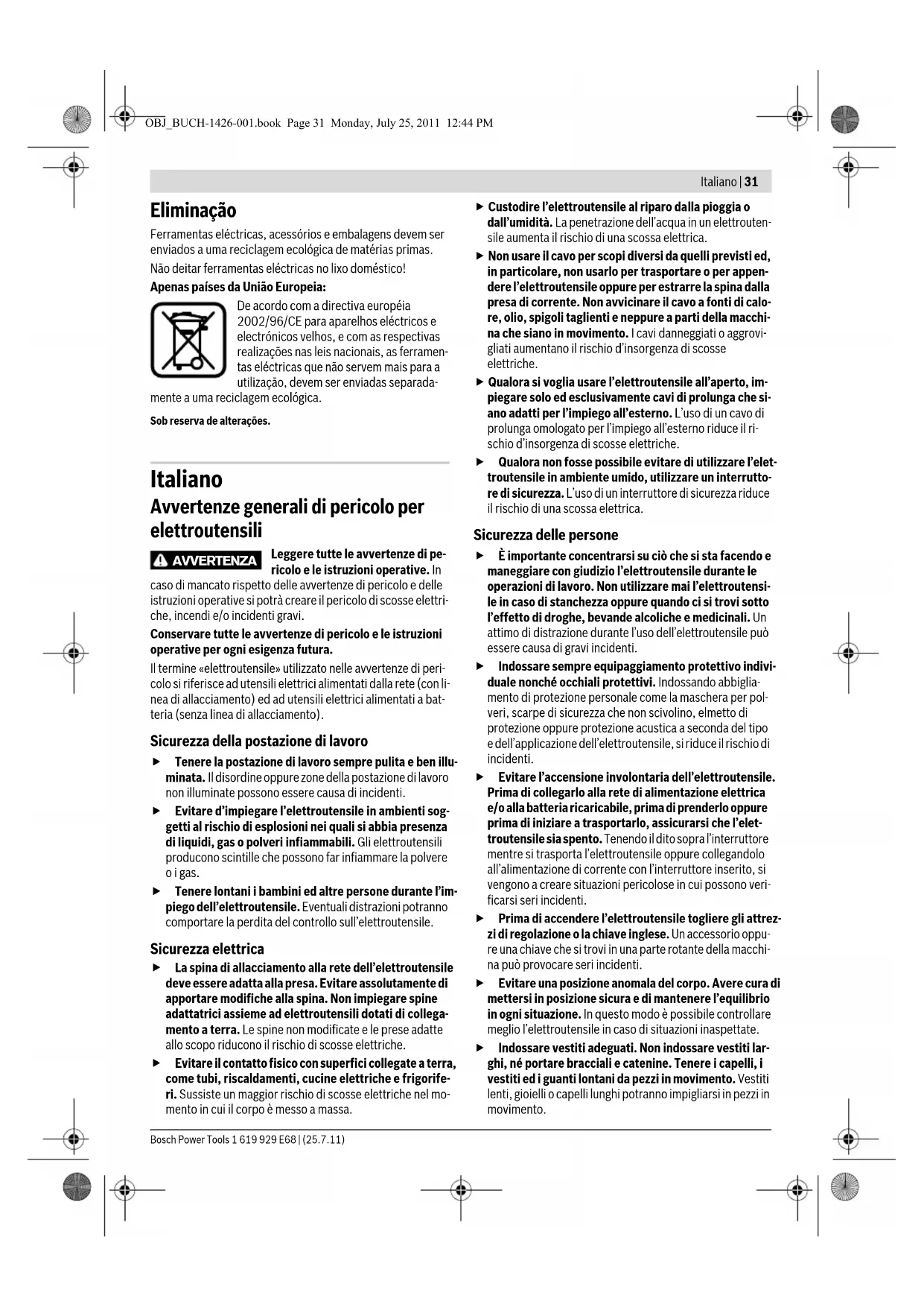 Conformmente alla direttiva europea 2002/96/CE sui rifiuti di apparecchiature elettriche ed elettroniche ed all'attuzione del recepimento nel diritto nazionale, gli elettroutensili diventati inservibili devono essere raccolti separatamente ed essere in