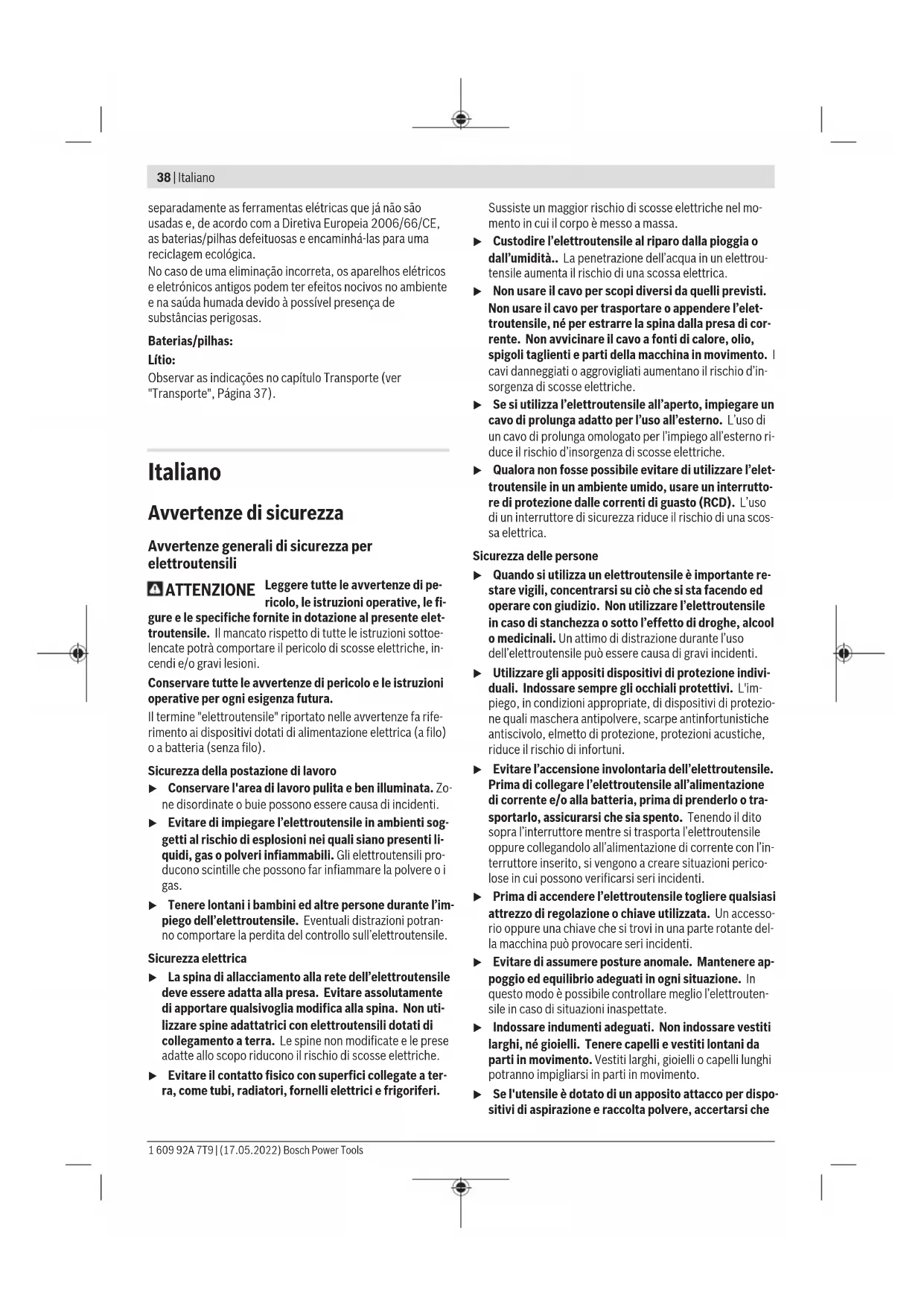 Il livello di vibrazione ed il valore di emissione acustica indi- cati nelle presenti istruzioni sono stati rilevati conformemen- te ad una procedura di misurazione unificata e sono utilizza- bili per confrontare gli elettroutensili. Le stesse procedure sono idonee anche per una valutazione temporanea del livel- lo di vibrazione e dell’emissione acustica. Il livello di vibrazione ed il valore di emissione acustica sono riferiti agli impieghi principali dell’elettroutensile; qualora, tuttavia, l’elettroutensile venisse utilizzato per altre applica- zioni, oppure con accessori differenti o in caso di insufficien- te manutenzione, il livello di vibrazione ed il valore di emis- sione acustica potrebbero variare. Ciò potrebbe aumentare sensibilmente l’emissione di vibrazioni e l’emissione acustica sull’intero periodo di funzionamento. Per valutare con precisione i valori di vibrazione e di emissio- ne acustica, andranno considerati anche i periodi nei quali l’utensile sia spento, oppure acceso, ma non utilizzato. Ciò potrebbe ridurre sensibilmente l’emissione di vibrazioni e l’emissione acustica sull’intero periodo di funzionamento. Adottare misure di sicurezza supplementari per proteggere l’operatore dall’effetto delle vibrazioni: ad esempio, sottopo- nendo a manutenzione l’elettroutensile e gli utensili accesso- ri, mantenendo calde le mani e organizzando i vari processi di lavoro. Montaggio u Prima di qualsiasi intervento sull’elettroutensile (ad es. interventi di manutenzione, sostituzione dell’ac- cessorio ecc.), prelevare la batteria, anche nel caso in cui occorra trasportarlo o conservarlo. In caso di azio- namento accidentale dell’interruttore di avvio/arresto sussiste pericolo di lesioni. Ricarica della batteria (vedereFig.A) u Utilizzare esclusivamente i caricabatterie indicati nei dati tecnici. Soltanto questi caricabatterie sono adatti al- le batterie al litio utilizzate nell’elettroutensile. Avvertenza: La batteria viene fornita solo parzialmente cari- ca. Per garantire l’intera potenza della batteria, prima dell’impiego iniziale, ricaricare completamente la batteria nell’apposito caricabatteria. La batteria al litio può essere ricaricata in qualsiasi momento senza ridurne la durata. Un’interruzione dell’operazione di ri- carica non danneggia la batteria. La batteria al litio è protetta contro lo scaricamento comple- to dal sistema «Electronic Cell Protection (ECP)». In caso di batteria scarica l’elettroutensile si spegne attraverso un in- terruttore automatico: l’accessorio non si muove più. u Dopo lo spegnimento automatico dell’elettroutensile, non premere ulteriormente l’interruttore di avvio/ar- resto. La batteria potrebbe subire danni. Per prelevare la batteria (7), premere il tasto di sbloccaggio (8) ed estrarre verso il basso la batteria dall’elettroutensile. Durante questa operazione, non esercitare forza. La chiave a brugola (12) necessaria per la sostituzione delle lame del pialletto è inserita all’interno dell’elettroutensile e deve essere sempre conservata in questa posizione (vedere figura A). Si prega di attenersi alle indicazioni relative allo smaltimen- to. Indicatore del livello di carica della batteria I LED verdi dell’apposito indicatore indicano il livello di cari- ca della batteria. Per ragioni di sicurezza, il livello di carica si può verificare esclusivamente ad elettroutensile fermo. Per visualizzare il livello di carica, premere il tasto dell’indi- catore livello di carica della batteria o . Ciò sarà possibi- le anche a batteria rimossa. Se premuto il tasto dell’indicatore livello di carica della batte- ria non si illumina alcun LED, ciò significa che la batteria è di- fettosa e che deve essere sostituita. Tipo di batteria GBA 18V... LED Autonomia Luce fissa, 3 LED verdi 60−100% Luce fissa, 2 LED verdi 30−60% Luce fissa, 1 LED verde 5−30% Luce lampeggiante, 1 LED verde 0−5% Bosch Power Tools 1 609 92A 7T9 | (17.05.2022)42 | Italiano Tipo di batteria ProCORE18V... LED Autonomia Luce fissa, 5 LED verde 80−100 % Luce fissa, 4 LED verde 60−80 % Luce fissa, 3 LED verdi 40−60 % Luce fissa, 2 LED verdi 20−40 % Luce fissa, 1 LED verde 5−20 % Luce lampeggiante, 1 LED verde 0−5 % Sostituzione delle lame per pialletto u Usare prudenza durante la sostituzione della lama per pialletto. Non afferrare la lama per pialletto dalla par- te del bordo tagliente. I bordi molto affilati potrebbero causare lesioni. Utilizzare esclusivamente lame per pialletto originali Bosch in metallo duro (HM/TC). La lama per pialletto in metallo duro (HM/TC) ha 2taglienti e può essere voltata. Se entrambi i bordi di taglio hanno perso il filo, la lama per pialletto (16) dovrà essere sostituita. La la- ma per pialletto in HM/TC non andrà riaffilata. Smontaggio della lama per pialletto (vedere fig. B) Per invertire o sostituire la lama per pialletto (16) ruotare la testa per la lama (13), finché non risulta parallela alla suola del pialletto (10).