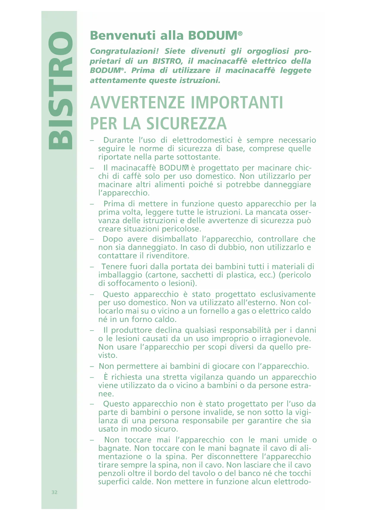 Congratulazioni! Siete divenuti gli orgogliosi pro- prietari di un BISTRO, il macinacaffè elettrico della BODUM