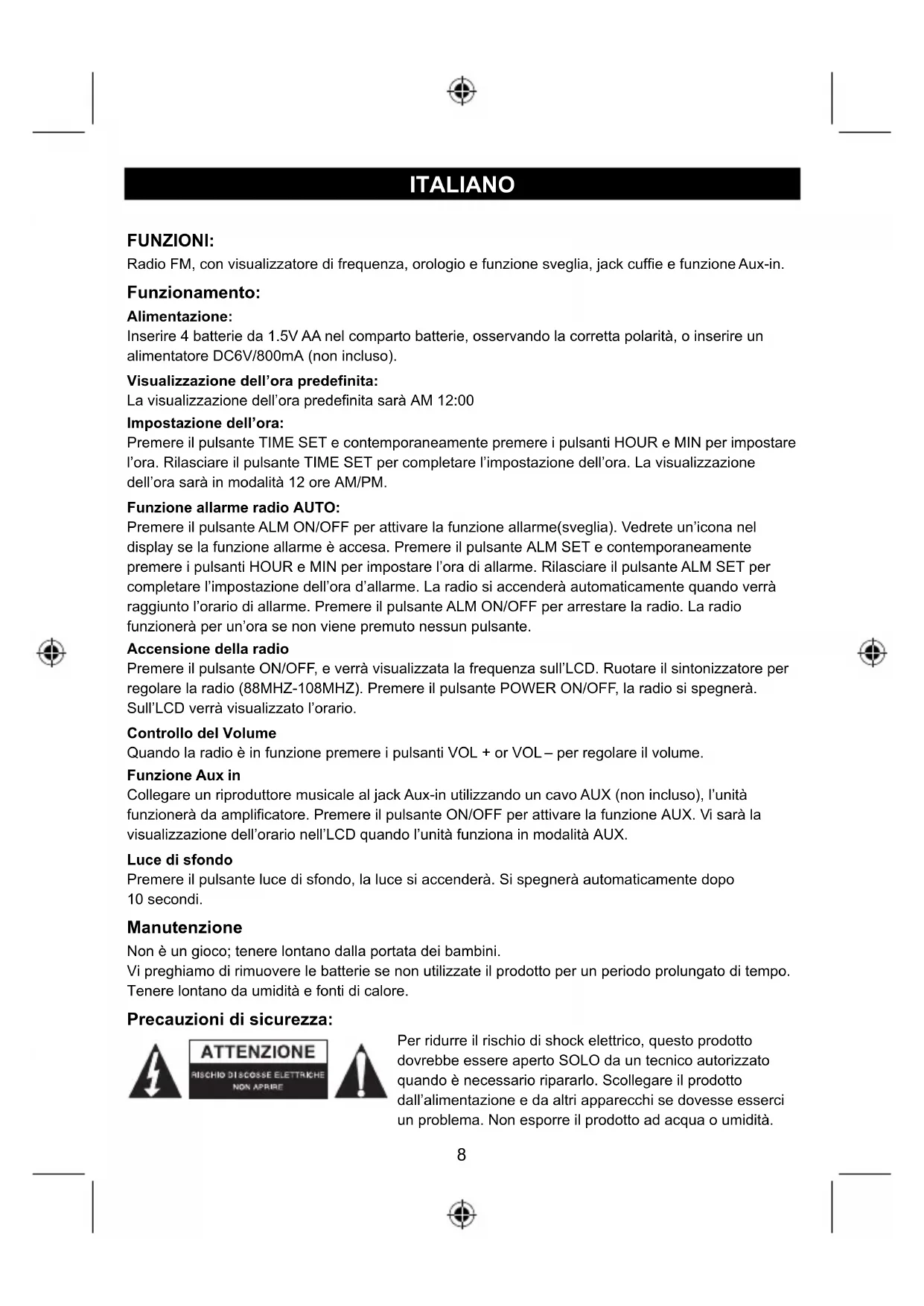 Premere il pulsante ON/OFF, e verrà visualizzata la frequenza sullLCD. Ruotare il sintonizzatore per regolare la radio (88MHZ-108MHZ). Premere il pulsante POWER ON/OFF, la radio si spegnerà. SullLCD verrà visualizzato l'orario.