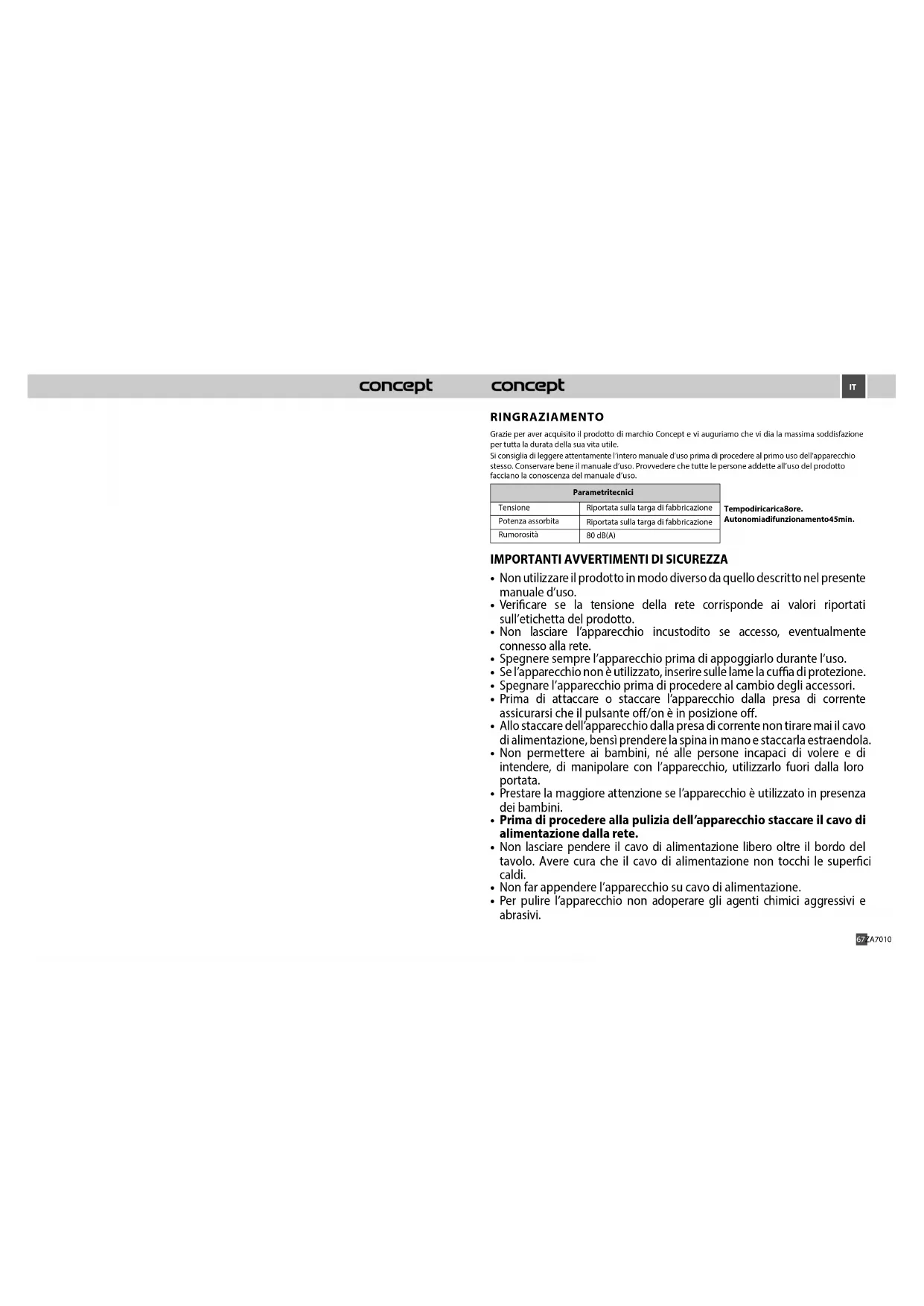 - Sacchetti in polietilene (PE) possono essere recuperati come rifiuto differenziato. Riciclaggio del prodotto alla fine della sua vita utile Il simbolo riportato sul prodotto indica che il prodotto stesso non può essere smaltito come rifiuto urbano. Va portato in un centro di raccolta dei rifiuti elettrici ed elettronici. Provvedendo allo smaltimento corretto del prodotto si può prevenire l’impatto negativo sull’ambiente e/o sulla salute umana nel caso di mancato riciclaggio. Le maggiori informazioni sulle modalità dello smaltimento del prodotto sono reperibili presso l’ufficio locale di amministrazione pubblica oppure nel negozio dove il prodotto è stato acquisito. Il presente prodotto rispetta tutti i requisiti fondamentali stabiliti dalle inerenti normative UE. Il produttore si riserva il diritto di modificare senza preavviso il testo del manuale d’uso, il design del prodotto e/o i suoi parametri tecnici. 55ZA 7010 ITES 75ZA7010 AGRADECIMIENTO Gracias por comprar este producto de la marca Concept y esperamos que quede satisfecho con él durante todo el tiempo que lo use. Antes de usar el producto, lea con cuidado todo el manual y luego guárdelo. Asegúrese de que las demás personas que vayan a utilizar el producto se familiaricen con el presente manual. Parámetros técnicos Tensión Indicado en la placa Potencia de entrada Indicado en la placa Nivel de ruido 80 dB(A)