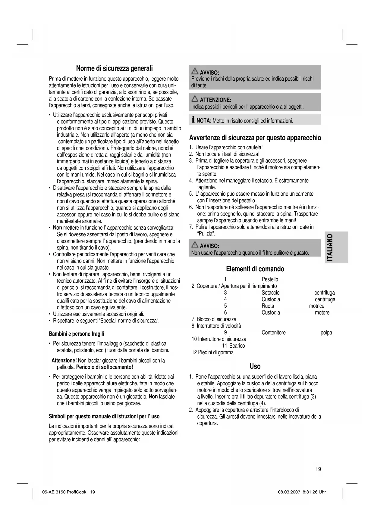 sicurezza. Gli arresti devono innestarsi nelle incavature della copertura. 05-AE 3150 ProfiCook 19 08.03.2007, 8:31:26 Uhr20 ITALIANO ITALIANO NOTA: L’apparecchio è munito di un interruttore di sicurezza (10). Evita un avviamento del motore non intenzionale. Controllare la giusta posizione degli elementi fi ltro centrifuga e copertura.