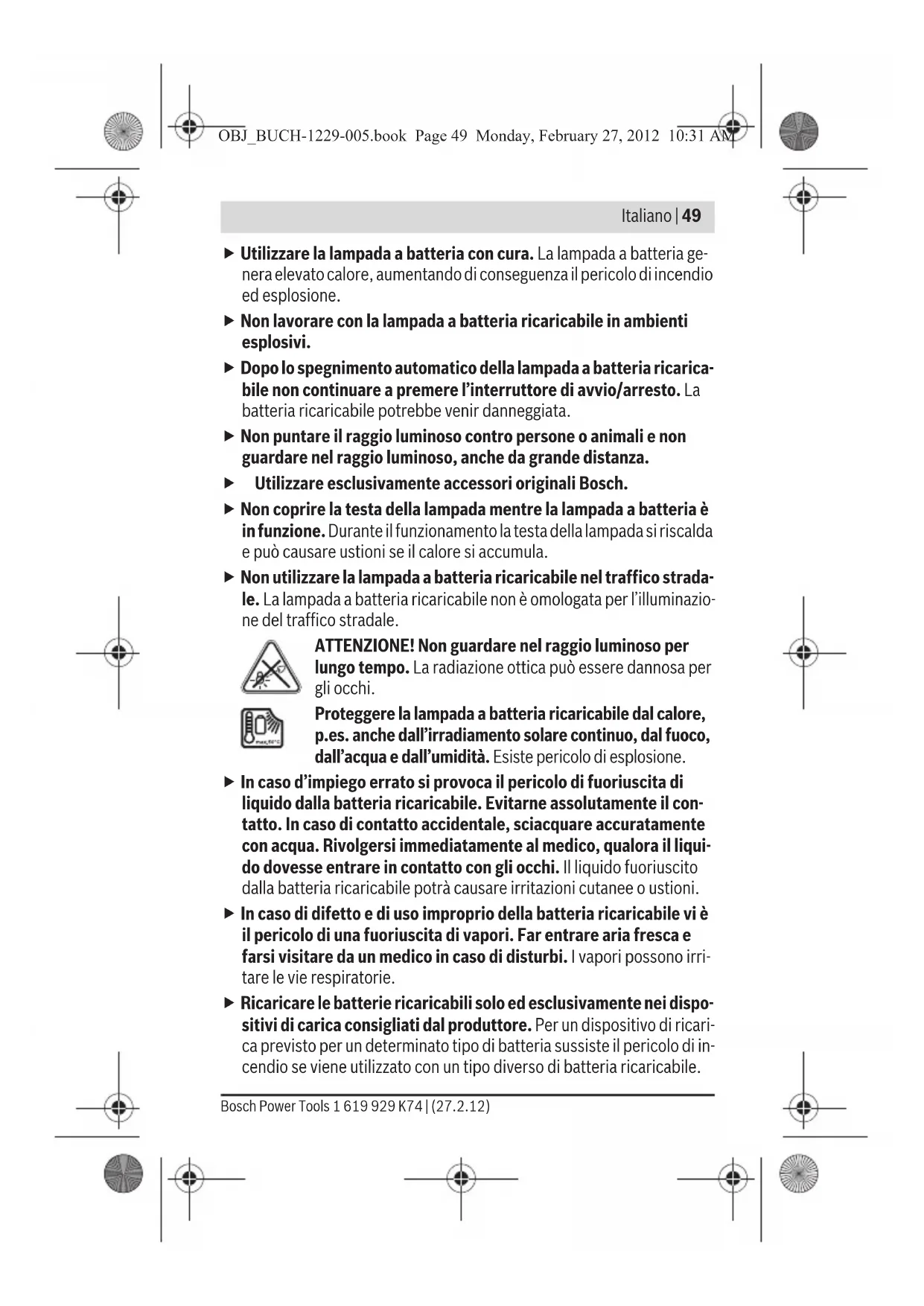 Tensione di ricarica della batteria V= 5,0 Corrente di carica mA 400 OBJ_BUCH-1229-005.book Page 51 Monday, February 27, 2012 10:31 AM1 619 929 K74 | (27.2.12) Bosch Power Tools 52 | Italiano Montaggio Caricare la batteria (vedi figura A) Nota bene: La batteria ricaricabile viene fornita parzialmente carica. Per garantire l’intera potenza della batteria ricaricabile, prima del primo im- piego ricaricare completamente la batteria ricaricabile nella stazione di ri- carica. Durante l’operazione di ricarica la lampada a batteria ricaricabile non può essere utilizzata, la stessa non è difettosa se durante l’operazione di rica- rica non funziona. La batteria ricaricabile a ioni di litio può essere ricaricata in qualsiasi mo- mento senza ridurne la durata. Un’interruzione dell’operazione di ricarica non danneggia la batteria ricaricabile. La batteria ricaricabile Li-Ion è protetta dalla «Electronic Cell Protection (ECP)» contro lo scaricamento totale. In caso di batteria ricaricabile sca- rica, la lampada a batteria ricaricabile viene spenta tramite un collega- mento di protezione. f Dopo lo spegnimento automatico della lampada a batteria ricarica- bile non continuare a premere l’interruttore di avvio/arresto. La batteria ricaricabile potrebbe venir danneggiata. Se durante la messa in funzione l’indicatore dello stato di carica della bat- teria 3 è illuminato in rosso, la batteria ha meno del 30 % di autonomia e dovrebbe essere ricaricata. Inserire la spina di ricarica 7 della stazione di ricarica nella presa 4 sul lato della lampada a batteria. f Osservare la tensione di rete! La tensione della rete deve corrispon- dere a quella indicata sulla stazione di ricarica. Stazioni di ricarica pre- viste per l’uso con 230 V possono essere azionate anche a 220 V. Campo ammesso di temperatura di ricarica °C 0–45 Tempo di ricarica h4,0 Numero degli elementi della batteria ricaricabile