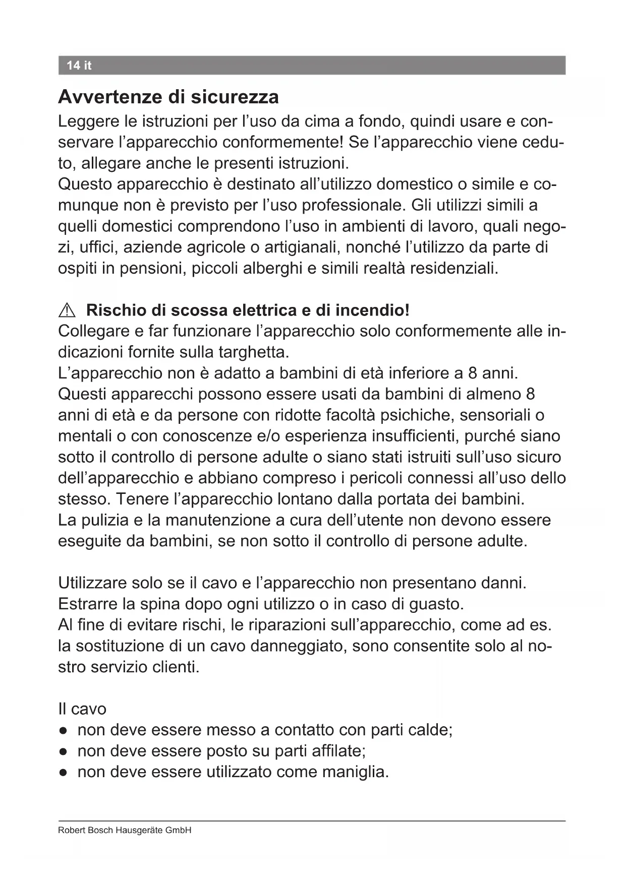 Pericolo di soffocamento! Non lasciare che i bambini giochino con il materiale di imballaggio.16 Robert Bosch Hausgeräte GmbH 16 it Congratulazioni per l’acquisto di questo apparecchio del nostro marchio Bosch. Avete acquistato un prodotto estre mamente valido e ne sarete molto soddisfatti. Elementi di comando ed accessori 1 Blocco L / U 2 Interruttore on / off con livello di calore 3 Spia di controllo on/off 4 Piastre riscaldanti 5 Gancio Messa in funzione ● Collegare l’apparecchio alla presa e ap- poggiarlo su una supercie non sensibile al calore. ● Selezionare il livello di temperatura desi- derata con l’interruttore 2. La spia di con- trollo 3 si illumina di rosso. 0 = off 1 = 160° C 2 = 200° C ● L’apparecchio si riscalda e dopo circa 35 secondi è pronto all’uso. ● Per spegnere, portare l’interruttore 2 su “0”. Utilizzo Pericolo di ustione! Evitare il contatto con la pelle (cuoio capelluto oppure orecchie). Prima dell’uso, aprire l’apparecchio tramite il dispositivo di sblocco 1 premendo su