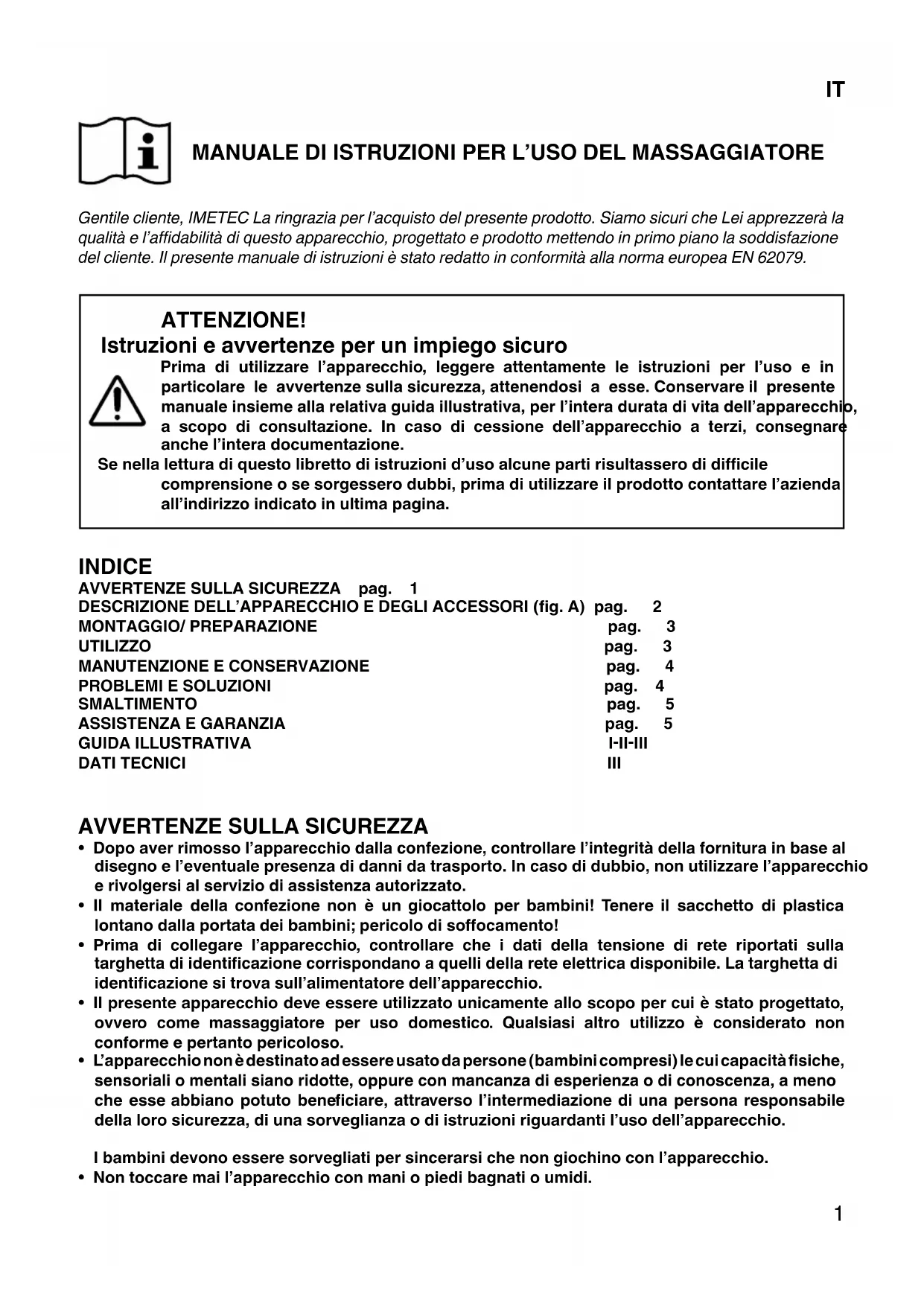 IT MANUALE DI ISTRUZIONI PER L’USO DEL MASSAGGIATORE Gentile cliente, IMETEC La ringrazia per l’acquisto del presente prodotto. Siamo sicuri che Lei apprezzerà la