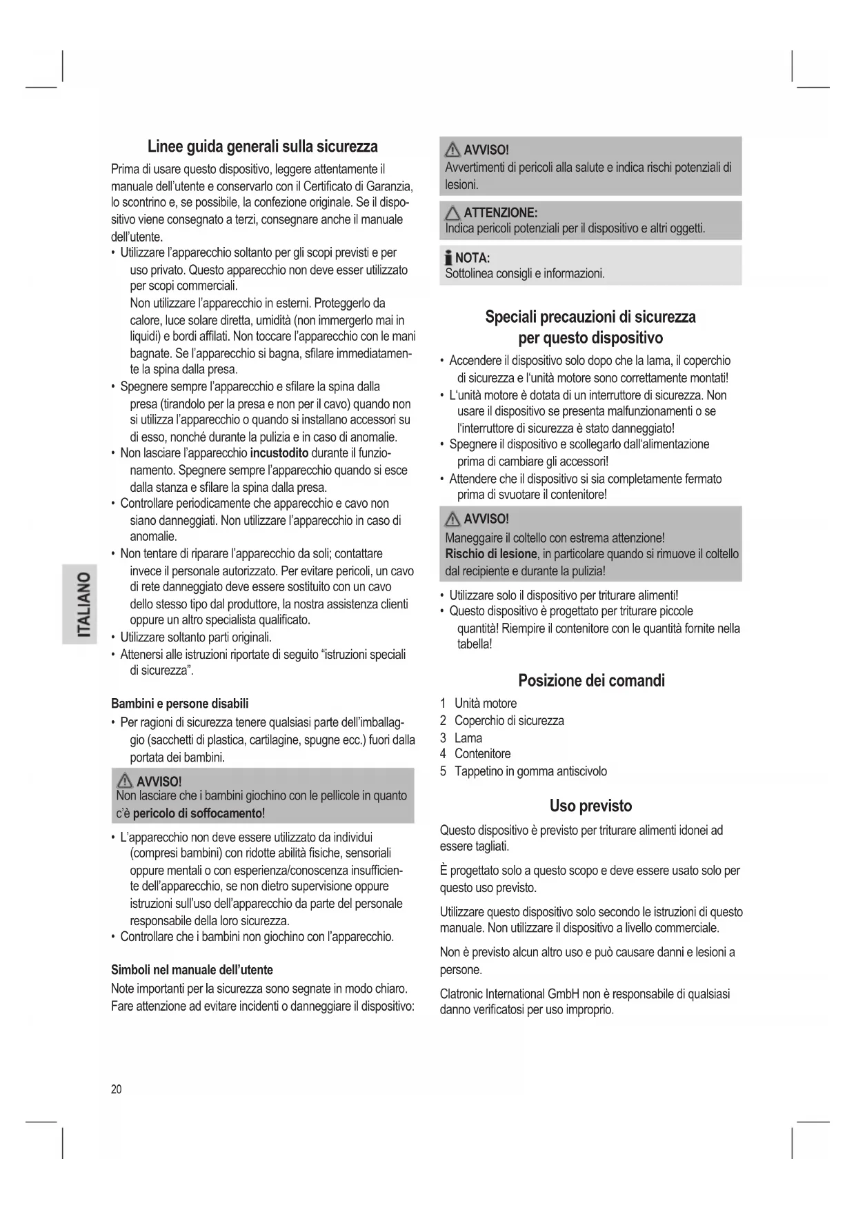 - Questo dispositivo è progettato per triturare piccole quantità! Riempire il contenitore con le quantità fornite nella tabella! Posizione dei comandi 1 Unità motore 2 Coperchio di sicurezza 3 Lama 4 Contenitore 5 Tappetino in gomma antiscivolo Uso previsto Questo dispositivo è previsto per triturare alimenti idonei ad essere tagliati. È progettato solo a questo scopo e deve essere usato solo per questo uso previsto. Utilizzare questo dispositivo solo secondo le istruzioni di questo manuale. Non utilizzare il dispositivo a livello commerciale. Non è previsto alcun altro uso e può causare danni e lesioni a persone. Clatronic International GmbH non è responsabile di qualsiasi danno vericatosi per uso improprio.21 Disimballare il dispositivo