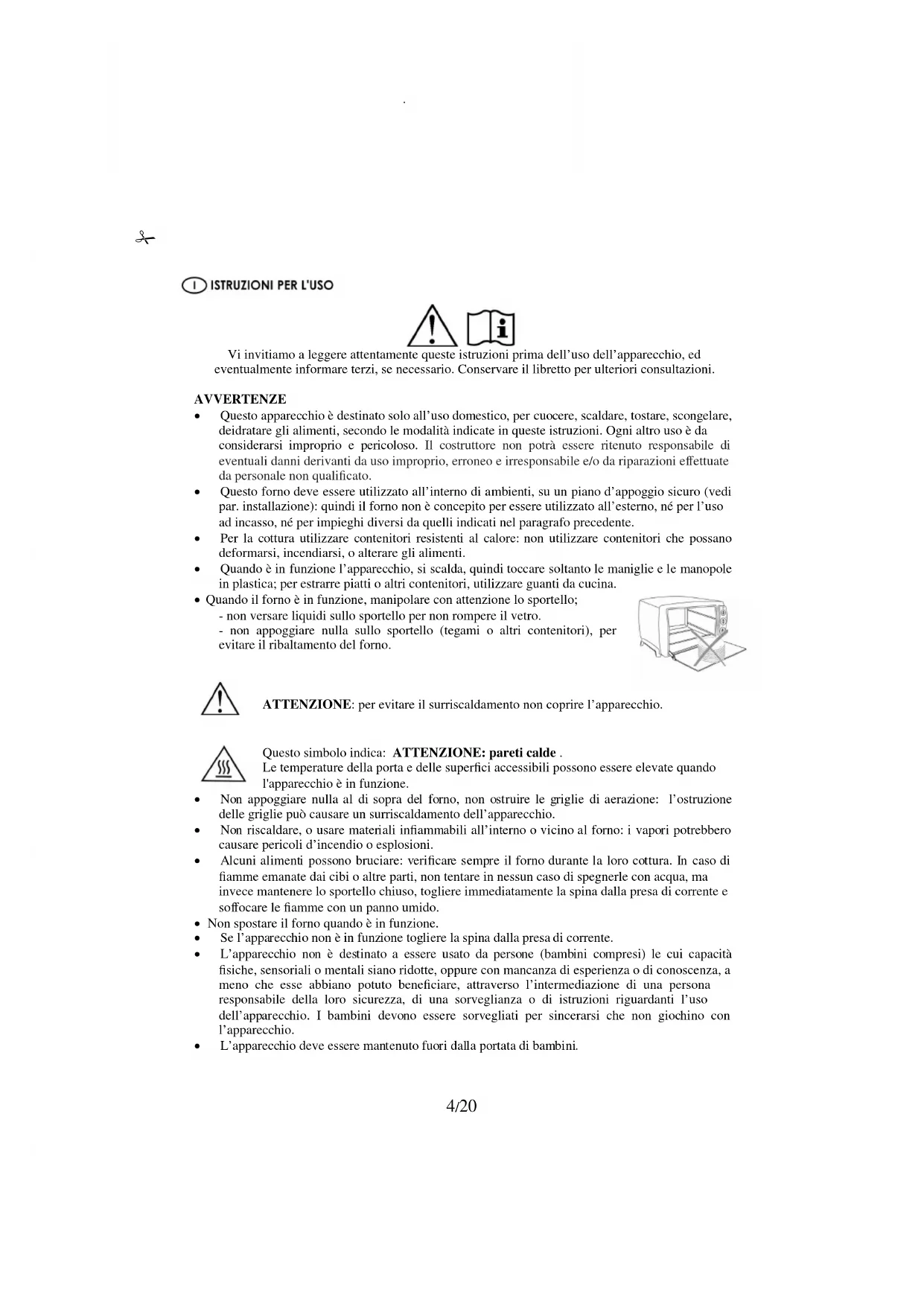 Questo apparecchio è destinato solo all'uso domestico, per cuocere, scaldare, tostare, scongelare, deidrataré gli alimenti, seconde le modalità indicate in queste istruzioni. Ogni altri uso è da considerarsi improprio e pericoloso. Il costruttore non può essere ritenuto responsable di eventuali danni derivanti da uso improprio, errone o irresponsabile e/o da riparazioni effettuate da personale non qualificato.