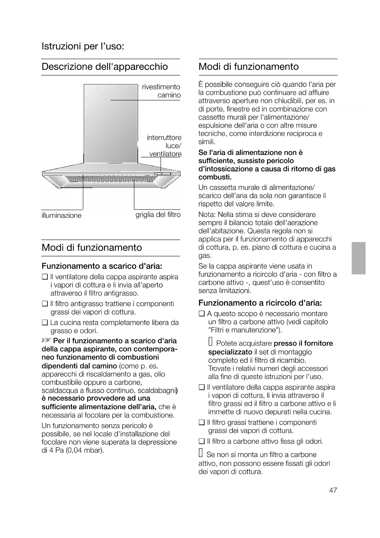 met twee schroeven opzij op de bevestigingshaak schroeven.47 illuminazione interruttore luce/ ventilatore griglia del filtro rivestimento camino Descrizione dell'apparecchio Istruzioni per l’uso: Modi di funzionamento Funzionamento a scarico d'aria: ❑ Il ventilatore della cappa aspirante aspira i vapori di cottura e li invia all'aperto attraverso il filtro antigrasso. ❑ Il filtro antigrasso trattiene i componenti grassi dei vapori di cottura. ❑ La cucina resta completamente libera da grasso e odori.