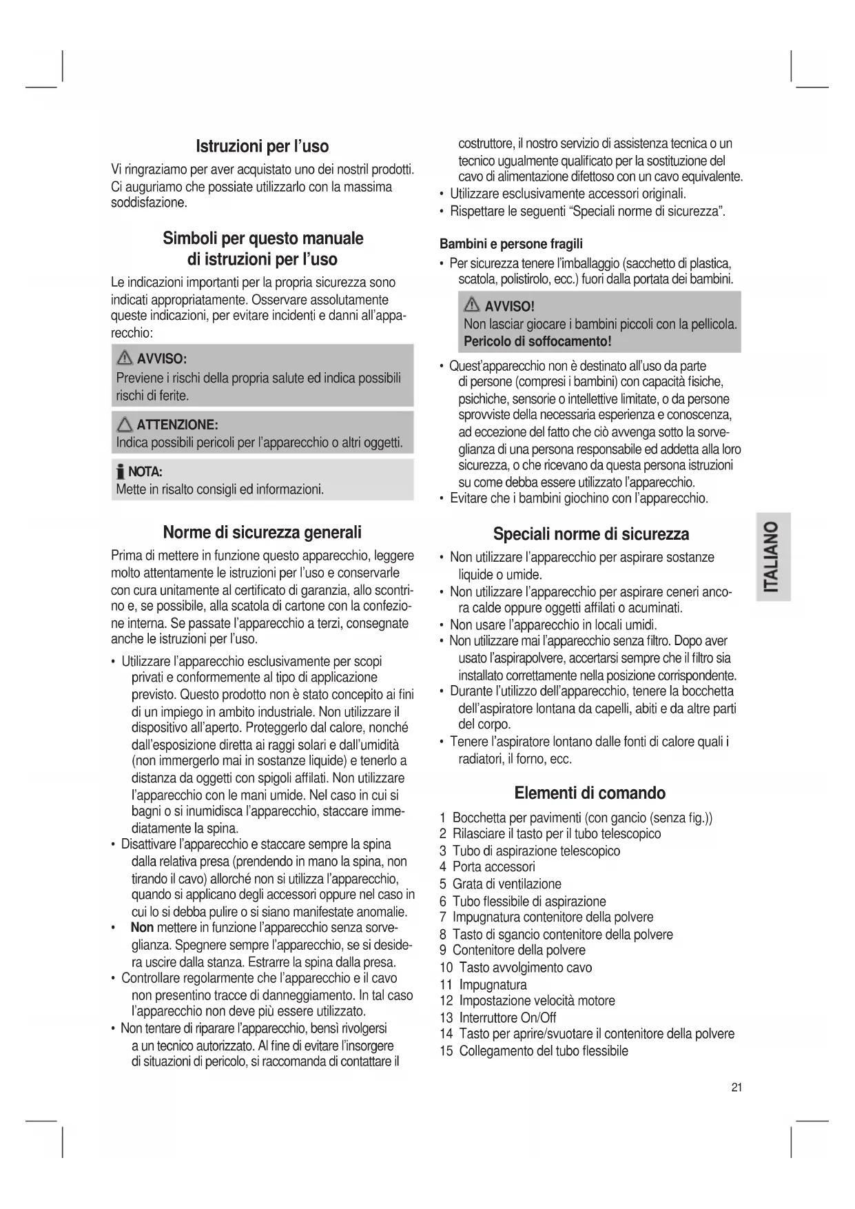 - Tenere l’aspiratore lontano dalle fonti di calore quali i radiatori, il forno, ecc. Elementi di comando 1 Bocchetta per pavimenti (con gancio (senza g.)) 2 Rilasciare il tasto per il tubo telescopico 3 Tubo di aspirazione telescopico 4 Porta accessori 5 Grata di ventilazione 6 Tubo essibile di aspirazione 7 Impugnatura contenitore della polvere 8 Tasto di sgancio contenitore della polvere 9 Contenitore della polvere 10 Tasto avvolgimento cavo 11 Impugnatura 12 Impostazione velocità motore 13 Interruttore On/Off 14 Tasto per aprire/svuotare il contenitore della polvere 15 Collegamento del tubo essibile Istruzioni per l’uso Vi ringraziamo per aver acquistato uno dei nostril prodotti. Ci auguriamo che possiate utilizzarlo con la massima soddisfazione. Simboli per questo manuale di istruzioni per l’uso Le indicazioni importanti per la propria sicurezza sono indicati appropriatamente. Osservare assolutamente queste indicazioni, per evitare incidenti e danni all’appa- recchio: AVVISO: Previene i rischi della propria salute ed indica possibili rischi di ferite. ATTENZIONE: Indica possibili pericoli per l’apparecchio o altri oggetti. NOTA: Mette in risalto consigli ed informazioni. Norme di sicurezza generali Prima di mettere in funzione questo apparecchio, leggere molto attentamente le istruzioni per l’uso e conservarle con cura unitamente al certicato di garanzia, allo scontri- no e, se possibile, alla scatola di cartone con la confezio- ne interna. Se passate l’apparecchio a terzi, consegnate anche le istruzioni per l’uso.