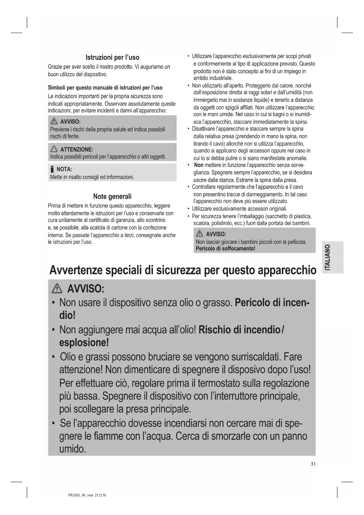 • Olio e grassi possono bruciare se vengono surriscaldati. Fare