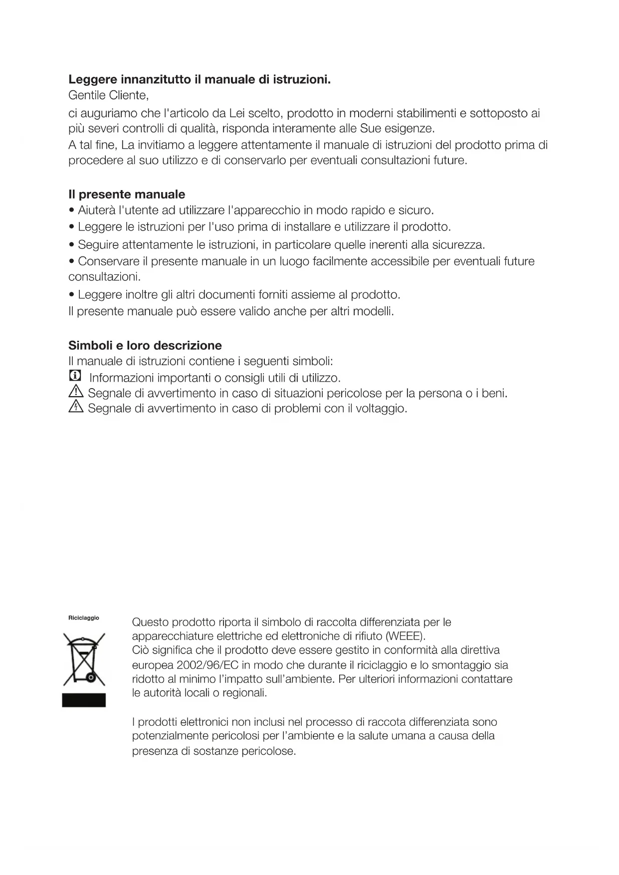 A tal fine, La invitiamo a leggere attentamente il manuale di istruzioni del prodotto prima di