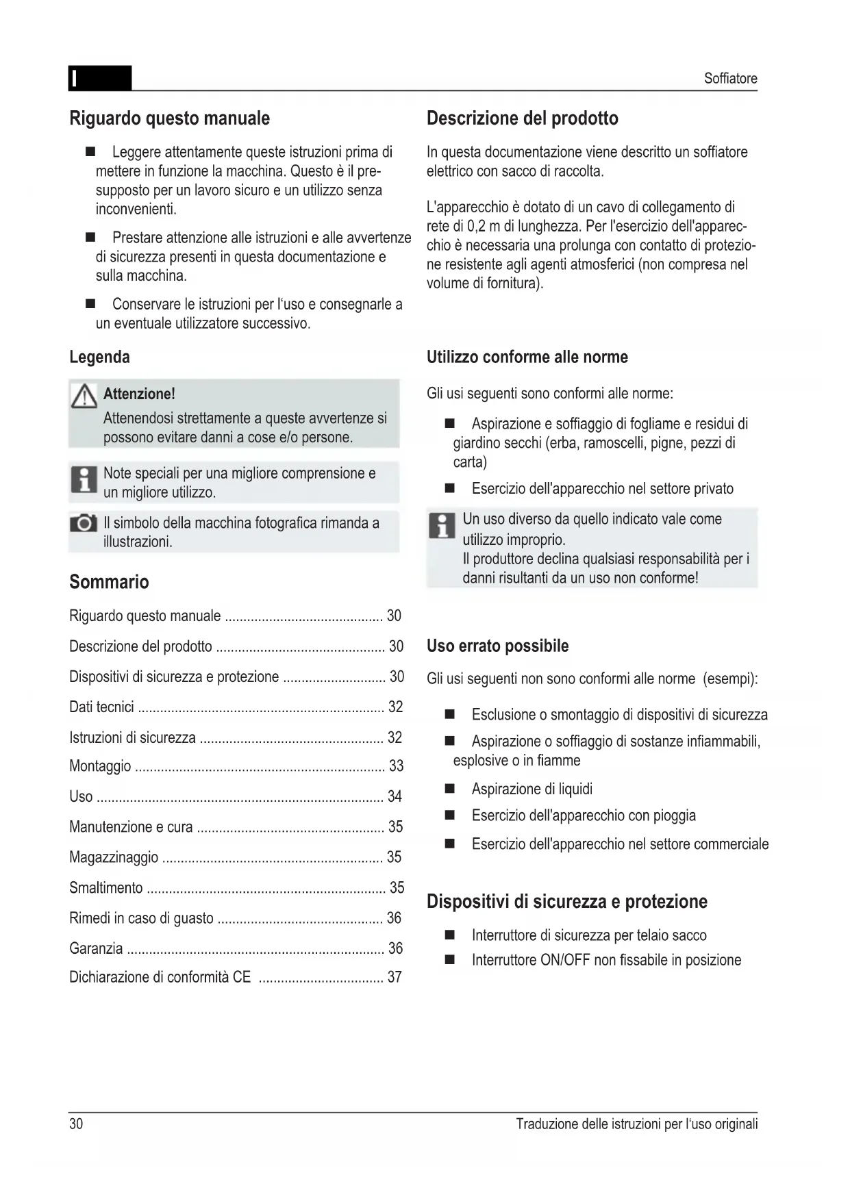 - Sofatore Descrizione del prodotto In questa documentazione viene descritto un sofatore elettrico con sacco di raccolta. L'apparecchio è dotato di un cavo di collegamento di rete di 0,2 m di lunghezza. Per l'esercizio dell'apparec- chio è necessaria una prolunga con contatto di protezio- ne resistente agli agenti atmosferici (non compresa nel volume di fornitura). Utilizzo conforme alle norme Gli usi seguenti sono conformi alle norme: Aspirazione e sofaggio di fogliame e residui di giardino secchi (erba, ramoscelli, pigne, pezzi di carta) Esercizio dell'apparecchio nel settore privato Un uso diverso da quello indicato vale come utilizzo improprio. Il produttore declina qualsiasi responsabilità per i danni risultanti da un uso non conforme! Uso errato possibile Gli usi seguenti non sono conformi alle norme (esempi): Esclusione o smontaggio di dispositivi di sicurezza Aspirazione o sofaggio di sostanze inammabili, esplosive o in amme Aspirazione di liquidi Esercizio dell'apparecchio con pioggia Esercizio dell'apparecchio nel settore commerciale Dispositivi di sicurezza e protezione Interruttore di sicurezza per telaio sacco Interruttore ON/OFF non ssabile in posizione Riguardo questo manuale Leggere attentamente queste istruzioni prima di mettere in funzione la macchina. Questo è il pre- supposto per un lavoro sicuro e un utilizzo senza inconvenienti. Prestare attenzione alle istruzioni e alle avvertenze di sicurezza presenti in questa documentazione e sulla macchina. Conservare le istruzioni per l‘uso e consegnarle a un eventuale utilizzatore successivo. Legenda Attenzione! Attenendosi strettamente a queste avvertenze si possono evitare danni a cose e/o persone. Note speciali per una migliore comprensione e un migliore utilizzo. Il simbolo della macchina fotograca rimanda a illustrazioni. Sommario Riguardo questo manuale p. 30